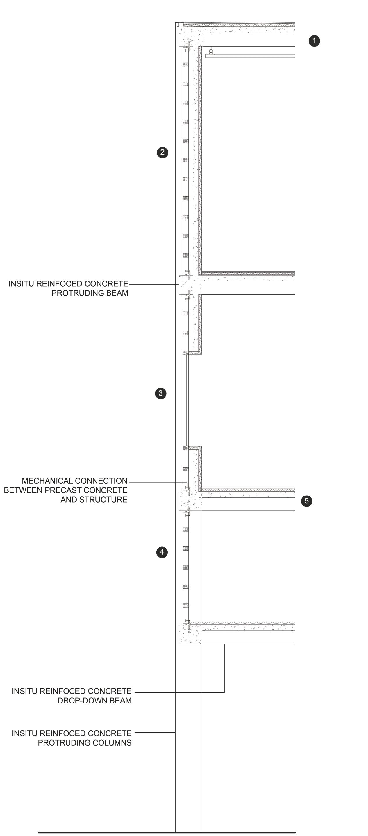 level, accessible via ramps at the four corners of the project. These ramps lead to an elevated street providing surface parking and shaded pedestrian walkways for office tenants. The façade treatment incorporates a metallic structure, vertical circulation elements, and oversized frames that accommodate commercial activities, signage, and advertising, blending functionality with aesthetic appeal.