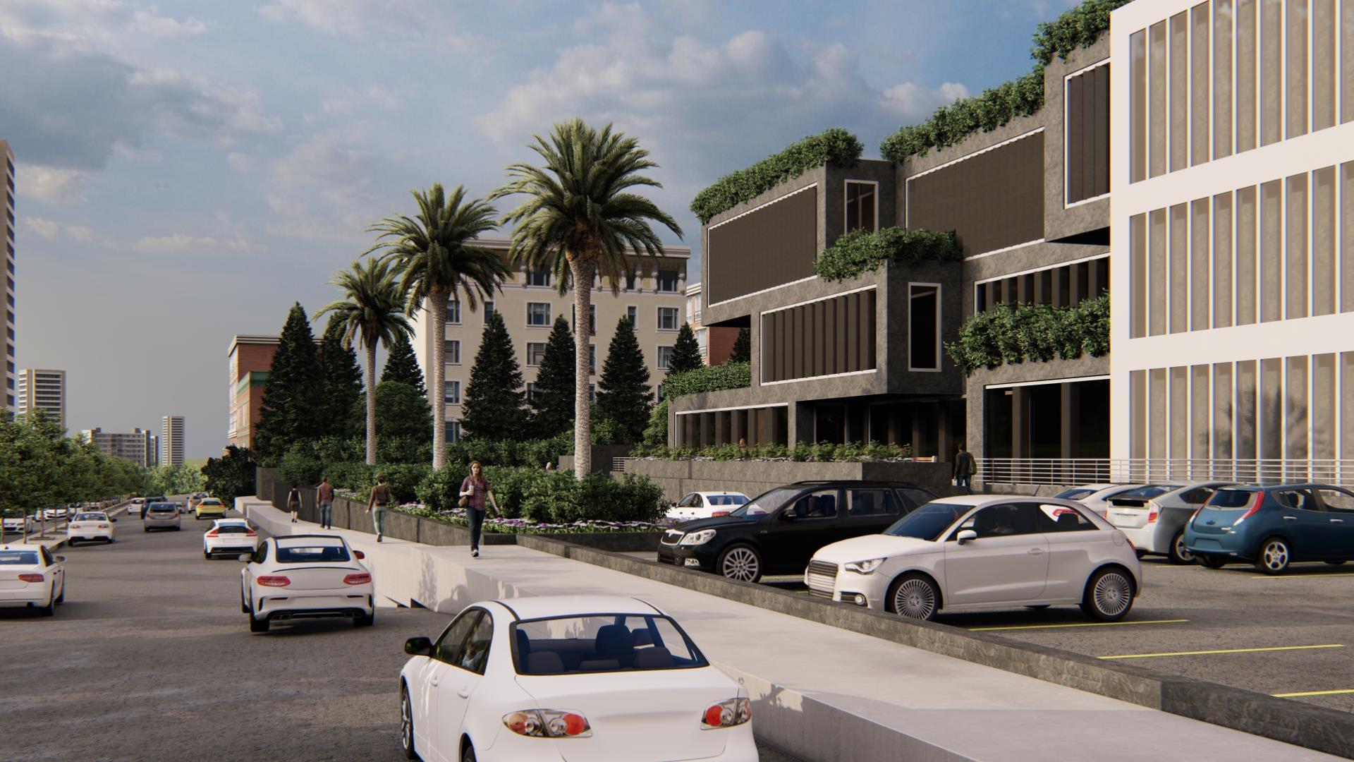 Provide adequate space and linkages for pedestrians and cyclists by emphasizing design features which buffer pedestrians from moving traffic.