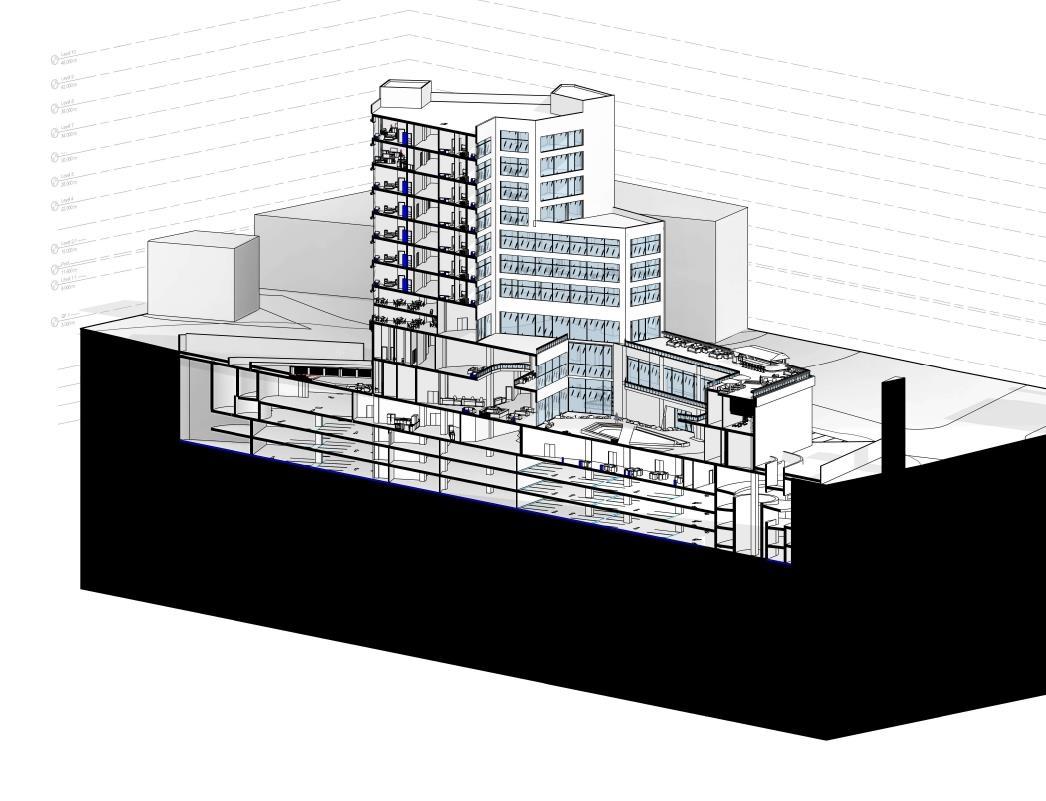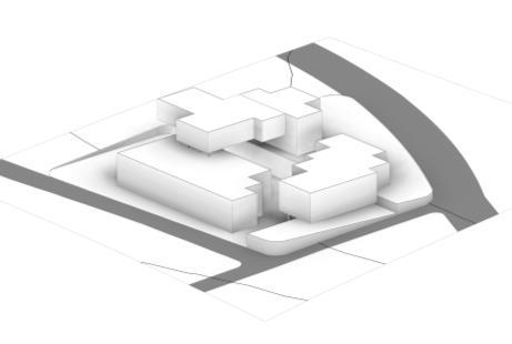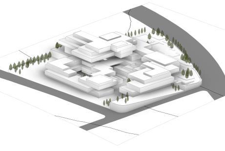Reducing the heights of the masses in a hierarchical way to reduce the intimidation of the building and in line with the winding paths