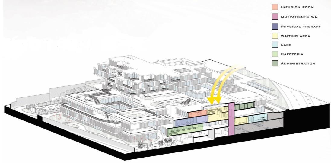 Vertical circulation for the outpatient's division connect between the labs, clinics, physical therapy and infusion room