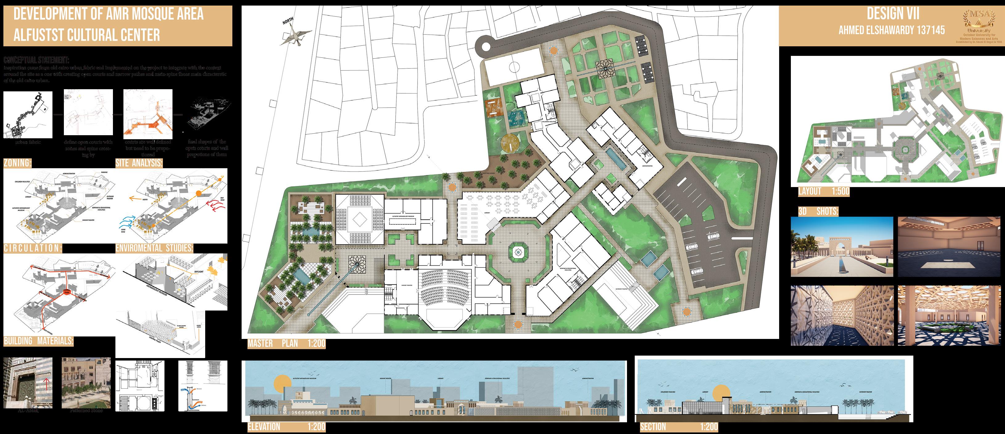 inspiration came from old cairo urban fabric and implemented on the projtect to integrate with the context around the site a one with creating opent courts, narrow paths and main spine. Main characteristic where appliend on the project so its achieve potential attraction and interaction also work as a development for the sourroundings.
