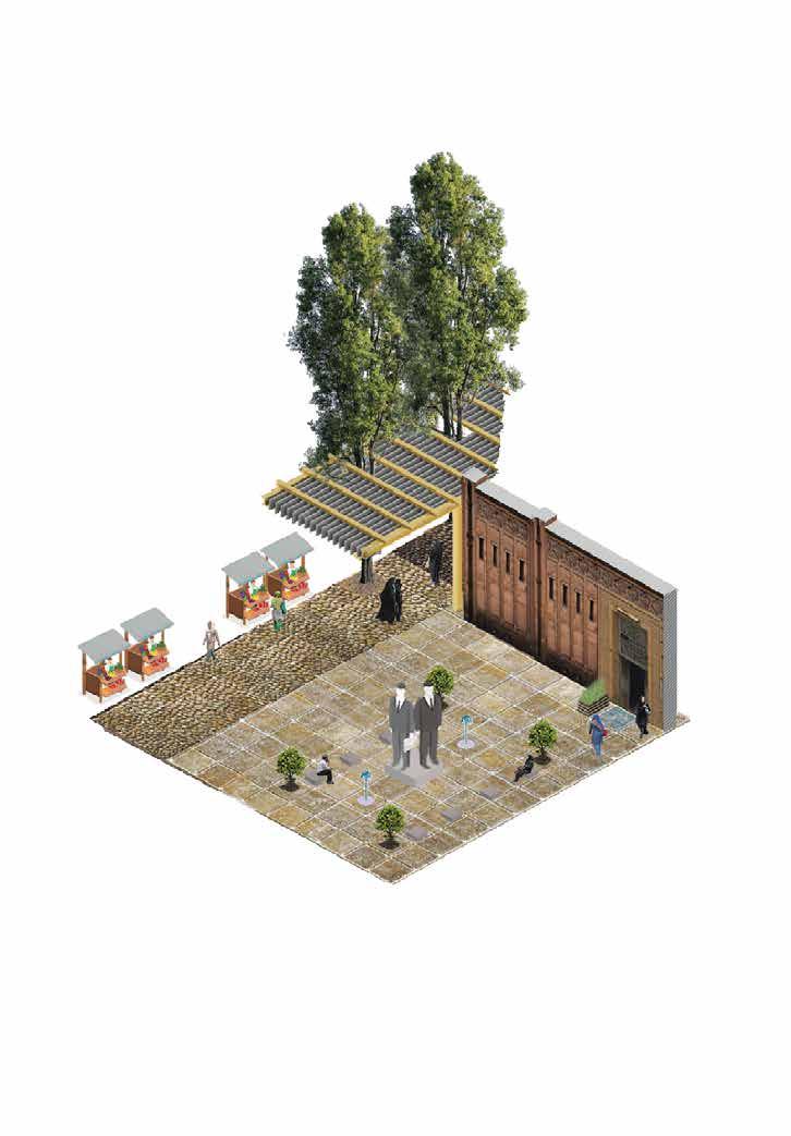 The main entrance, which has been defined by removing part of the wall, connecting the courtyard with Chaharbagh, and creating a plaza (square). A building with restored verandas will serve as a café connected to the theme of textiles, clothing, and fashion, serving the city.