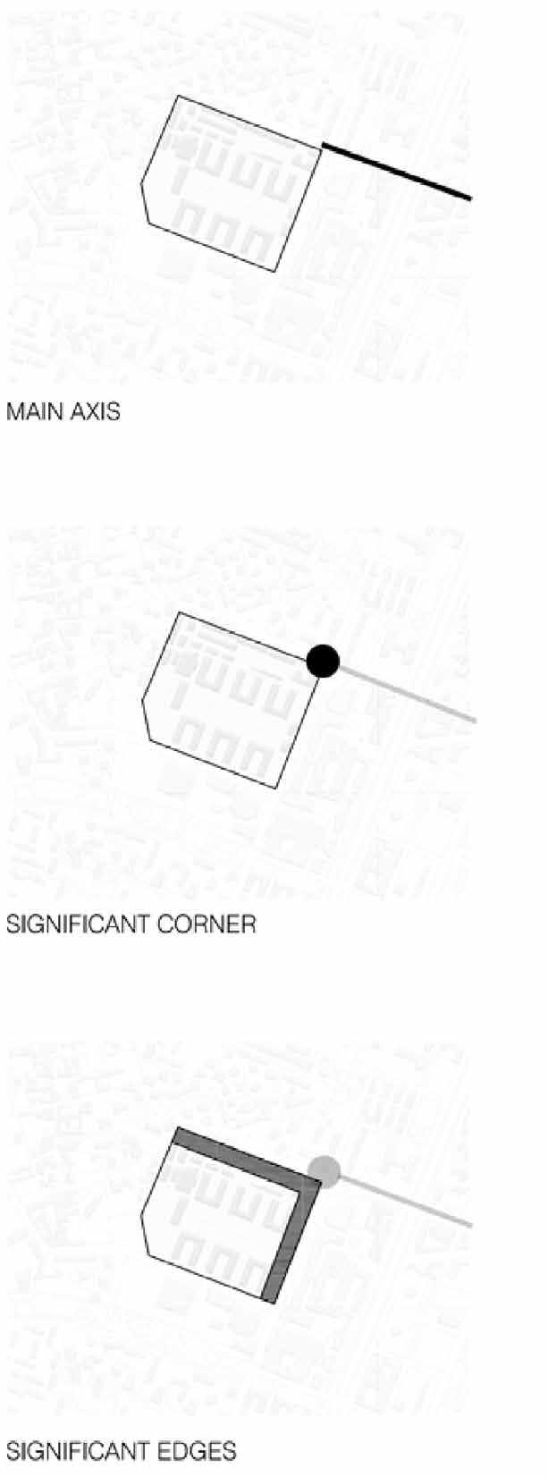 The important thing about the edges is that these edges should not block the visual access and readability of the rest of the site. The best choice is to avoid building on the most critical edge. At the same time the system of courtyards should be strengthened.