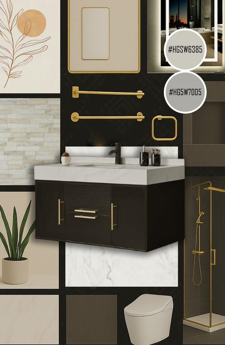 The remodel approach is to give the bathroom a sleek, modern, and luxurious aesthetic. The walls and floor are now clad in large-format white marble-look tiles with subtle gray veining, giving the space a clean and high-end feel. The old vanity has been replaced with a modern floating vanity in a dark finish, topped with a white counter top and gold-accented fixtures. A backlit LED mirror adds both style and functionality, significantly improving lighting. The outdated shower area has been transformed into a spacious glass-enclosed shower with gold trim, enhancing the sense of openness and elegance.