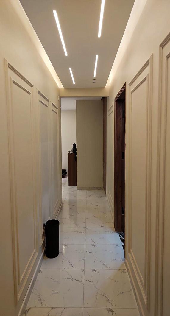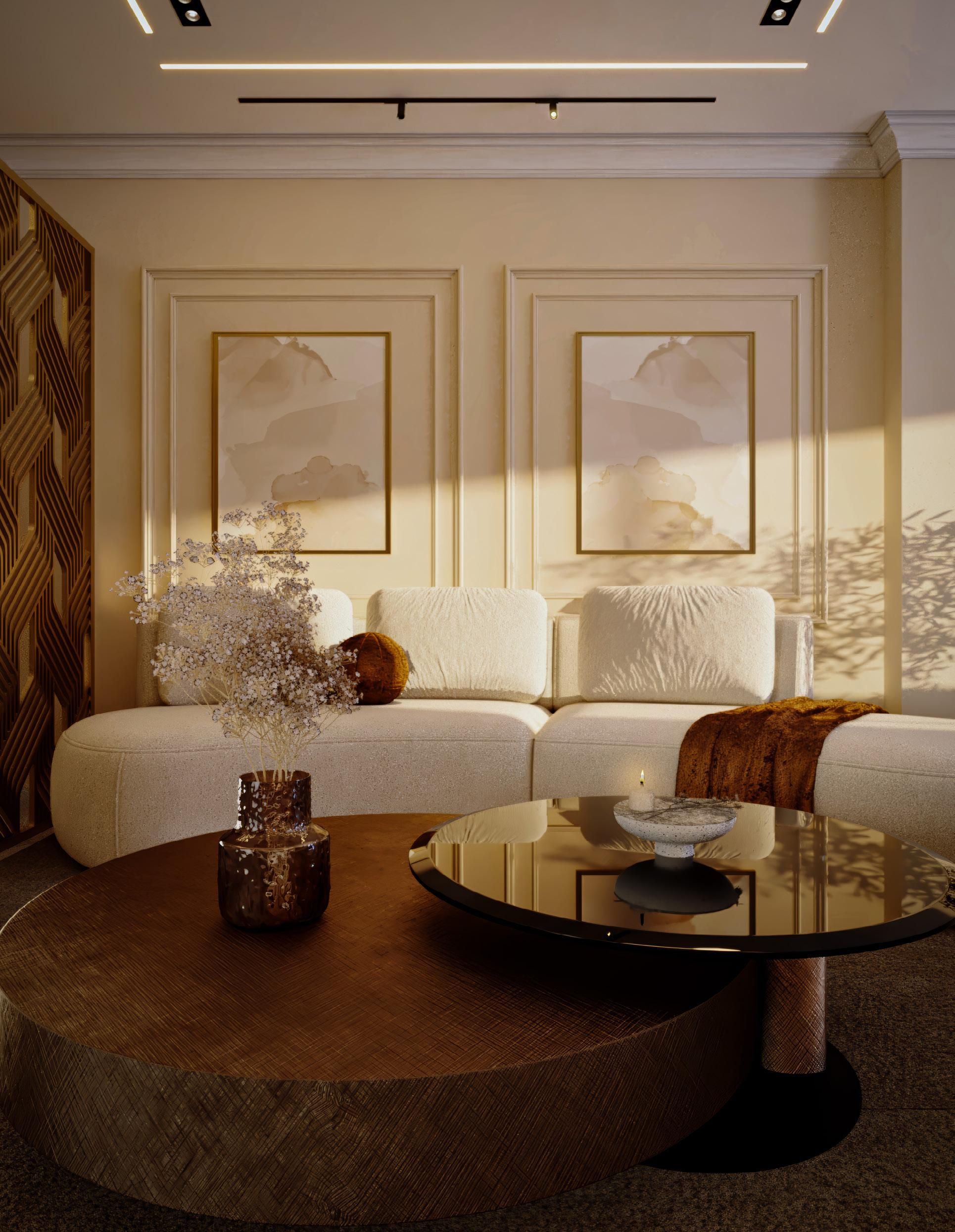 This apartment combines modern minimalism with neoclassical elegance, creating a warm and sophisticated atmosphere. Neutral tones, wall molding panels, and layered ceiling lighting enhance the architectural depth of the space. A sculptural chandelier, modular seating, and statement coffee tables add both form and function. Thoughtful touches like indoor greenery, curated décor, and textured textiles bring balance and personality, resulting in a timeless yet contemporary design perfect for everyday comfort and stylish living.