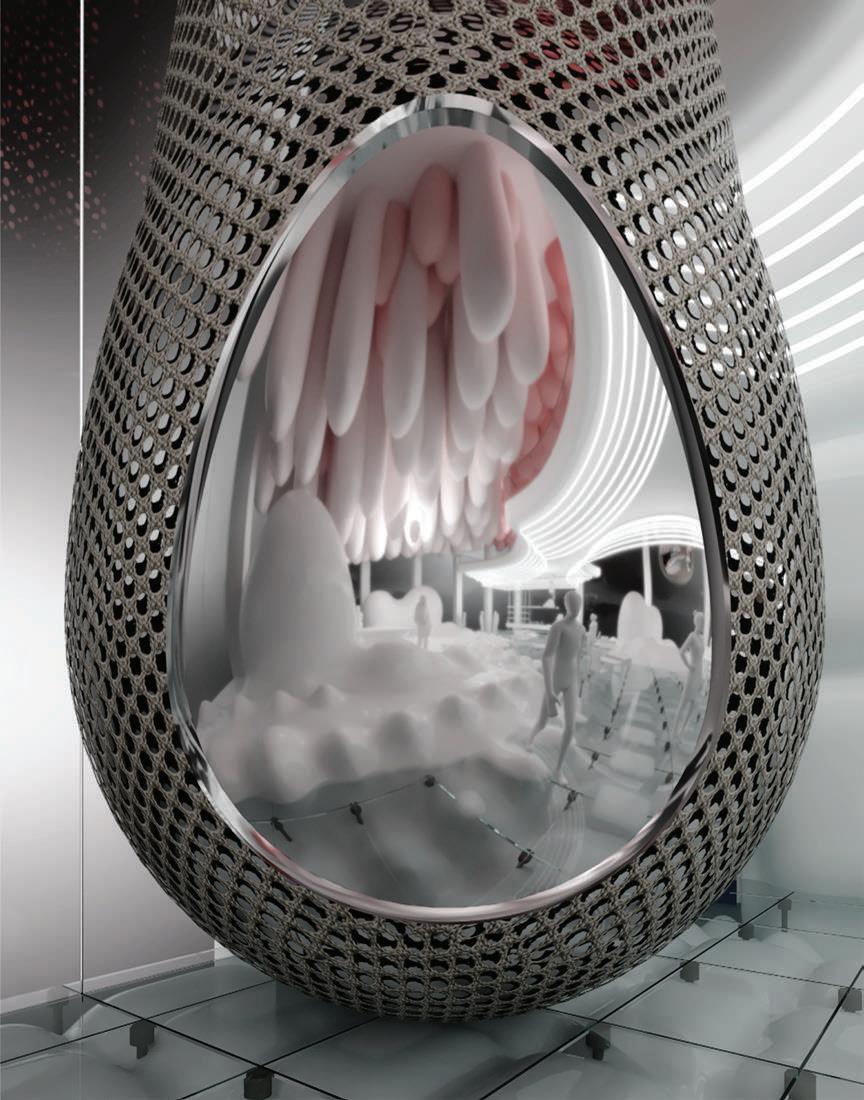 Design Process - Our design solves this problem by breaking the o ce into 3 layers of privacy: private, semi-private, and public. The design is located in a ctional High-rise, expressing the design’s intent in generating a dynamic space t for any o ce. The single-person work pod is designed for more private phone calls and meetings. This pod descends to the ground from the ceiling, picking up an employee before retracting back into the sealed acoustic environment.