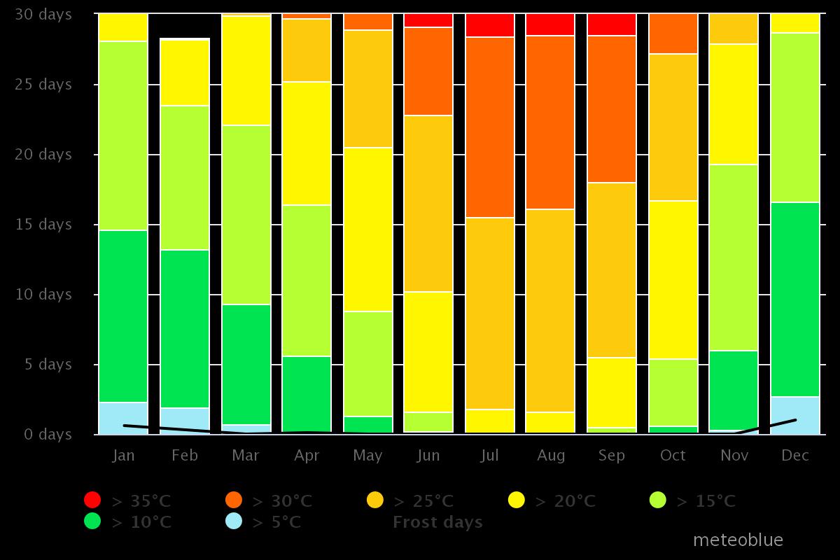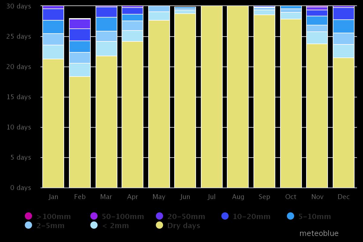 The precipitation diagram for Mountain View shows on how many days per month, certain precipitation amounts are reached. In tropical and monsoon climates, the amounts may be underestimated.