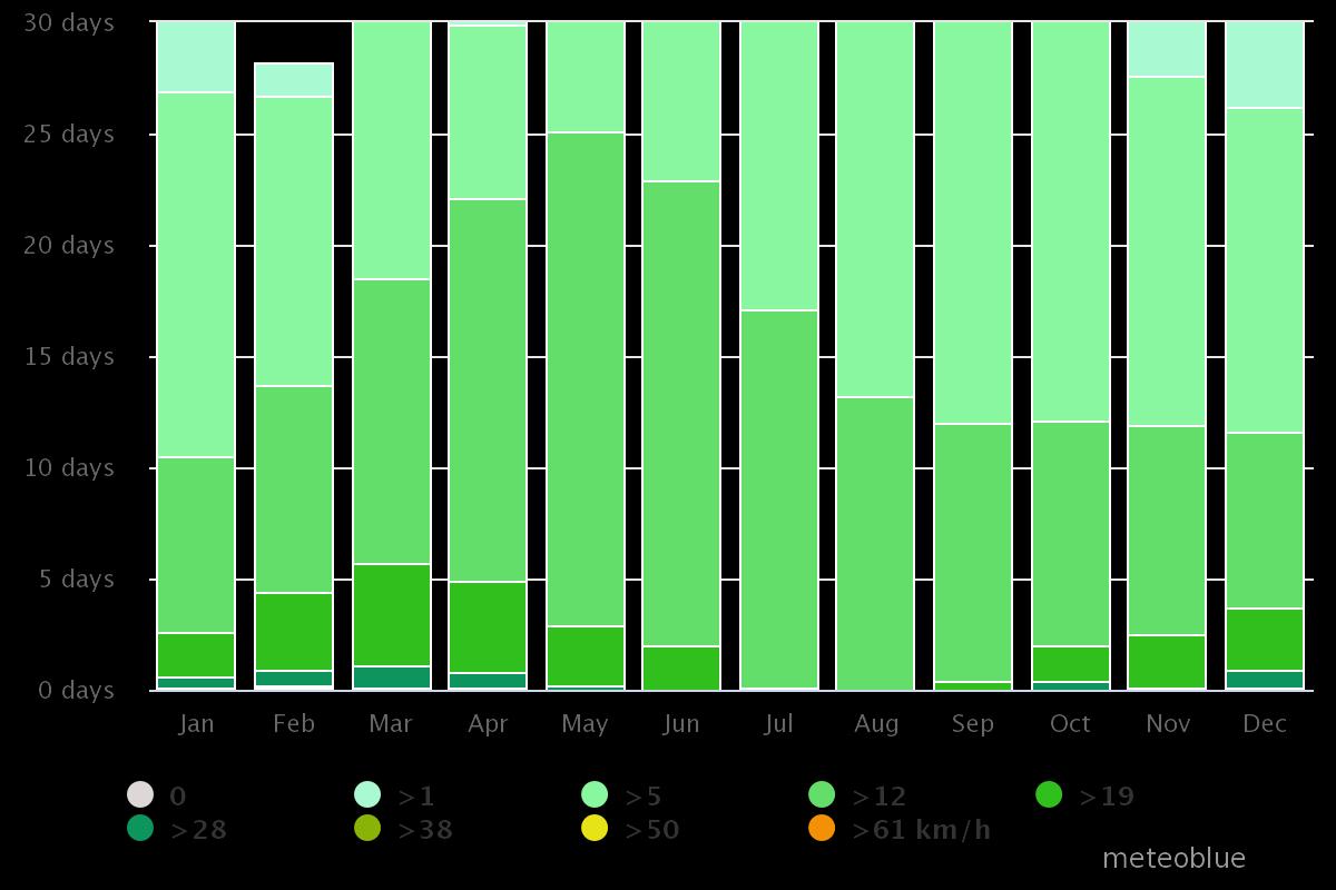 The diagram for Mountain View shows the days per month, during which the wind reachesacertainspeed.AninterestingexampleistheTibetanPlateau,wherethemonsoon creates steady strong winds from December to April, and calm winds from June to October.