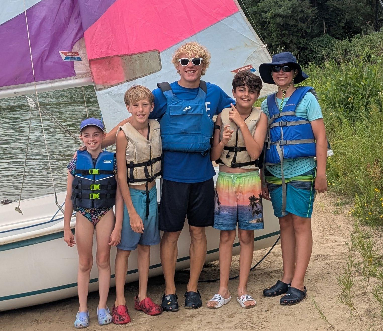 Each day sailors have four to five hours of sailing, including free sail time to practice their skills. On land, the sailors have two hours of land instruction, including terms and safety. Other activities include games, movies and crafts. Campers are grouped according to ability. A list of items needed is sent prior to camp. Campers must be able to float comfortably in lake water with a P.F.D. (Personal Flotation Device). There is a swim test on first day, be prepared to get wet. (KK)