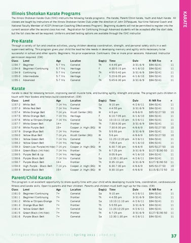 Parent/Child Karate This program is an excellent opportunity to share quality time with your child while developing muscle tone, coordination, cardiovascular fitness and karate skills. Open to parents and their children. Parents and children must both sign up for the class. (EW) Class Level Age Location Day(s) Time Date R/NR Fee # 1161-0 Beginner/Continuing 7+ Camelot Sa 9-10 am 4/2-6/11 $94/$141 11 1161-1 Beginner/Continuing 7+ Frontier Th 4-4:55 pm 3/31-6/9 $94/$141 11 1161-2 White w/Stripes-Orange 7+ Camelot Sa 10:10-11:10 am 4/2-6/11 $94/$141 11 1161-3 Orange-Blue Belt 7+ Frontier Th 5-5:55 pm 3/31-6/9 $94/$141 11 1161-4 Yellow-Green Belt 7+ Camelot Sa 11:20-12:20 pm 4/2-6/11 $94/$141 11 1161-5 Green-Black (Int/Adv) 7+ Frontier Th 6-7:25 pm 3/31-6/9 $127/$190.50 11 1161-6 Purple-Black Belt 7+ Camelot Sa 12:30-1:30 pm 4/2-6/11 $94/$141 11