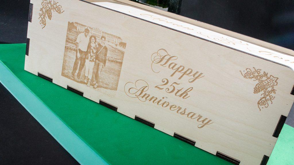 All our wine boxes are custom-made from scratch from 1/4″ Baltic Birch plywood, they are not imported boxes. We can laser names, dates, poems, verses, graphics, and photos (all with permission of course. The photos you provide will be photoshopped into a blended pencil sketch that lasers nicely.