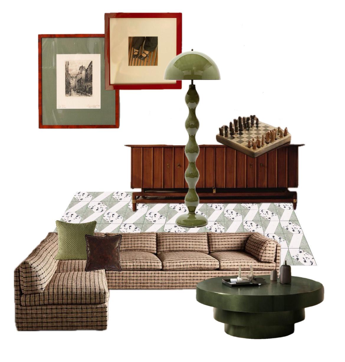 Un ambiente raccolto e sofisticato, dove tonalità calde, verdi polverosi e legni profondi creano una stratificazione visiva che dona profondità e intimità.