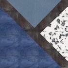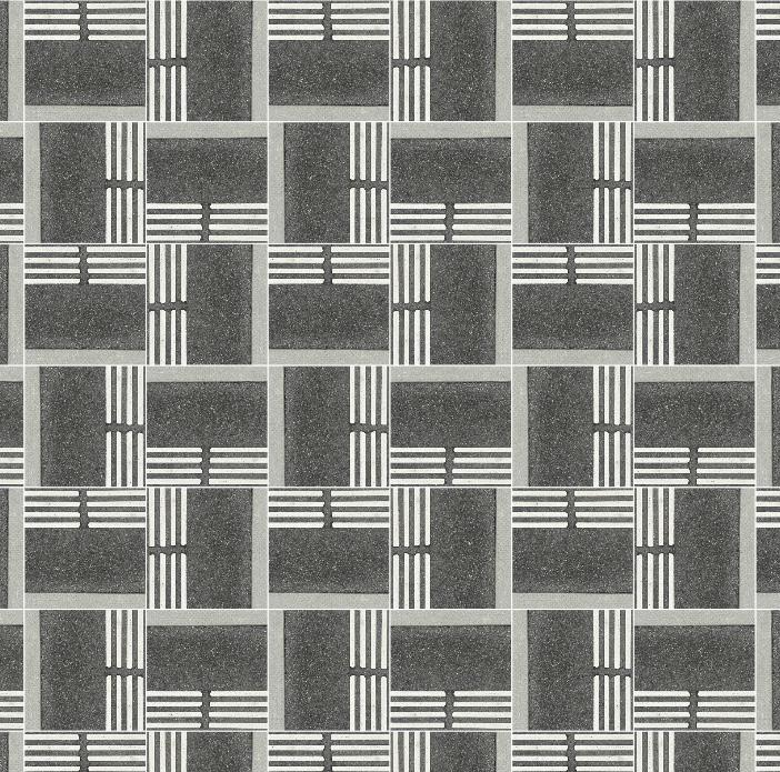 La piastrella geometrica combina ottagoni bianchi e rombi blu-arancio con texture terrazzo, creando un motivo vivace dal gusto retrò. È inserita in un ambiente evocativo e scenografico ispirato al mondo balneare, dove contribuisce a ricreare un’atmosfera estiva e vivace.
