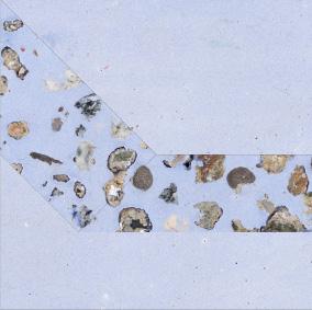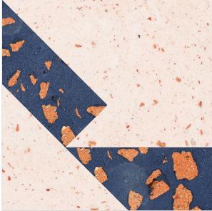 Il pavimento con motivi geometrici in bianco e blu aggiunge un elemento decorativo e un senso di profondità allo spazio.Il contrasto tra i motivi geometrici e la fluidità del paesaggio marino crea un interessante gioco visivo.