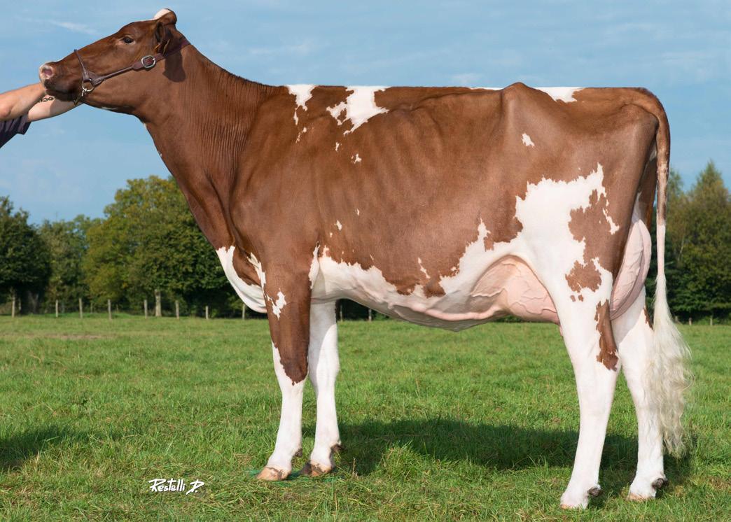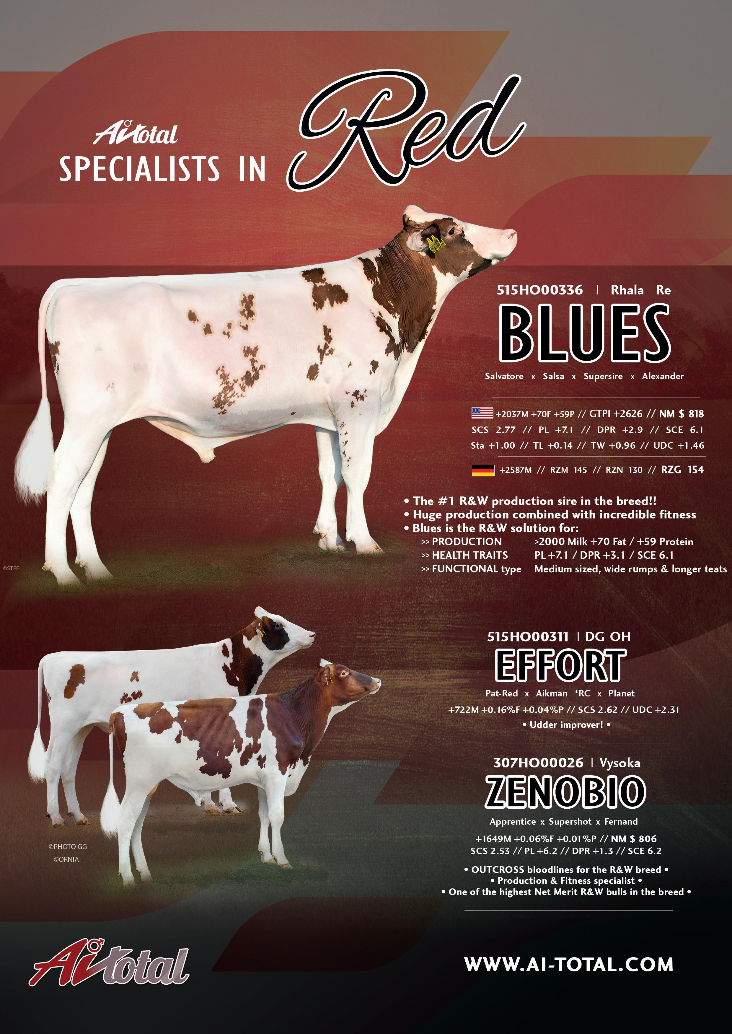 A true health specialist is 307HO00014 RAFTER . His Calving Ease is a low 5,1 (SCE), Productive Life an amazing +8,6 (PL), Somatic Cell Score a healthy 2,48 and RAFTER his score for Daughter Pregnancy Rate is +4,0 (DPR). In the R&W breed AI Total has a remarkable bull: 515HO00336 BLUES RED. Productive Life is +7,1 (PL), Calving Ease 6,1 (SCE), DPR +2,9 and Fertility Index +2,8 FI. Not only the health traits of BLUES RED are well, he also excels in production with lots of milk: +2037 lbs PTAM. BLUES RED reaches a GTPI of +2626; extraordinary in the R&W breed.