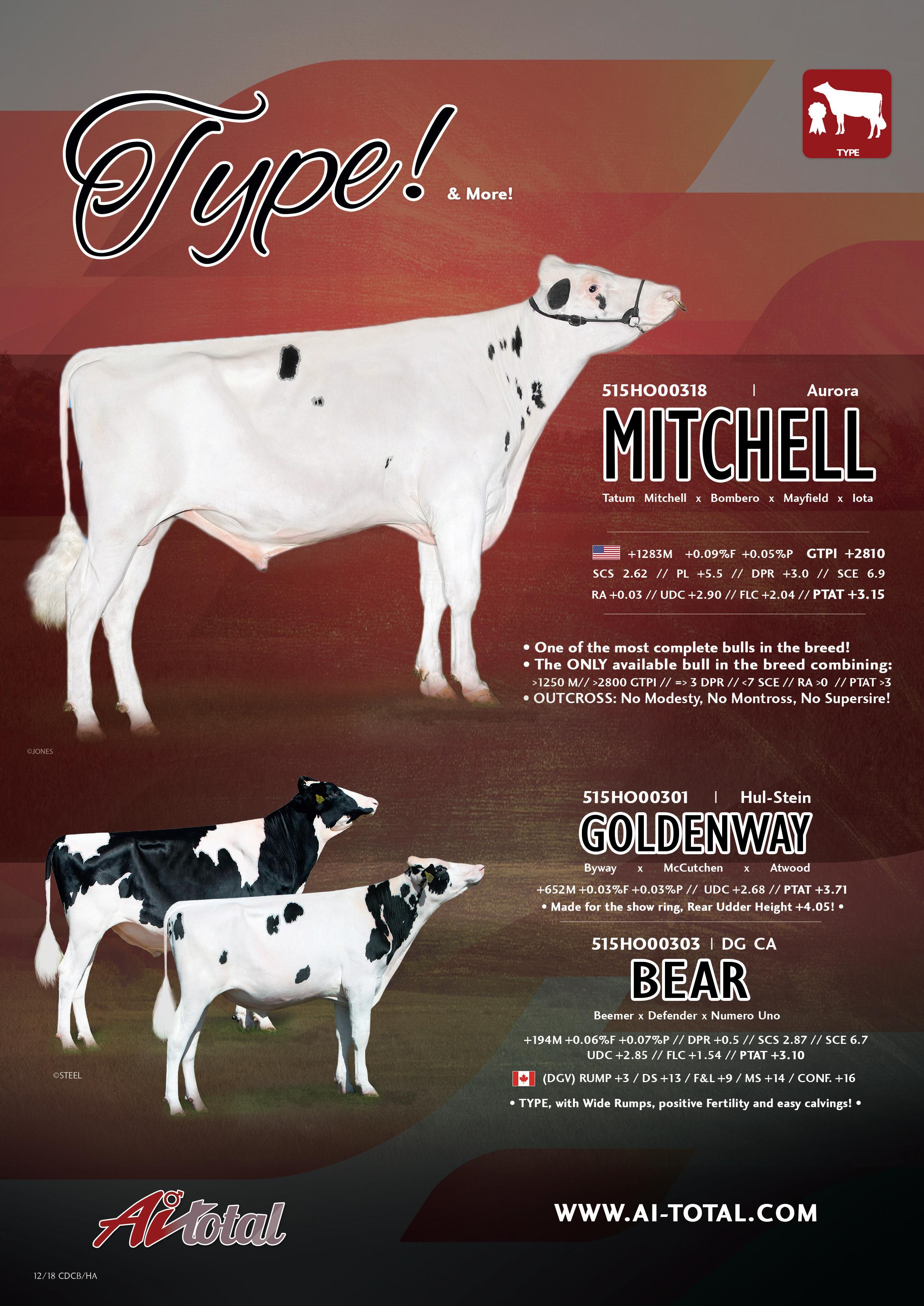 515HO00337 DELICIOUS is the new grazing specialist at AI Total. His Daughter Pregnancy Rate is +3,5 (DPR) and Calving Ease is very low with 5,0% (SCE). DELICIOUS breeds smaller cows and brings positive components: +0,06% Fat (+ 71 lbs) & +0,02% Protein (+ 50 lbs). Productive life is very long with +7,3 (PL). Top in the AI Total lineup remains 515HO00318 MITCHELL with a Fertility Index of +3,3 (FI) and a DPR +3,0. MITCHELL is a fantastic complete bull with high production (astonishing GTPI of +2810), great in Type (PTAT +3.15, UDC +2,90 & FLC +2,04) and outcross (Mitchell x Bombero x Mayfield).