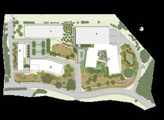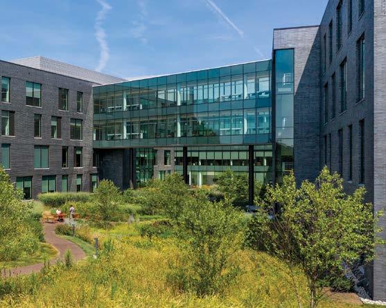 The mixed-use campus will also include an office building, hotel and parking garage, cohesively designed with shared assets and complementary uses. The design of the parcel flips the former office park model, placing buildings at the periphery of the site and eliminating surface parking. Garages bring staff and visitors closer to their destinations and preserve large portions of the parcel for lush green spaces. n