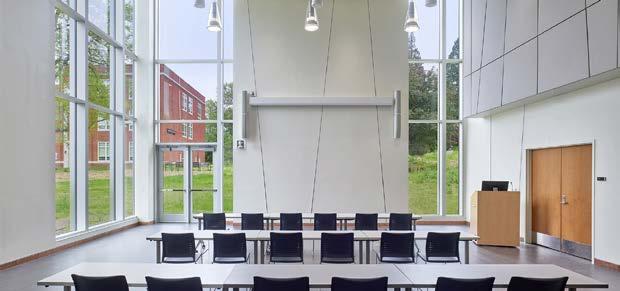 classrooms, seminar rooms, offices, and specialty spaces. Collaborative spaces serving as institutional engagement environments include a main commons, open study, lounge, and group study spaces.
