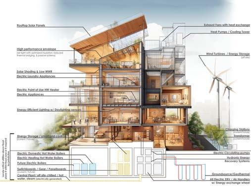 WINTER 2024 Policy & Design Building Electrification, Clean Energy, and Advocacy Citizen Architect • Designing Policy 202 3 DESIGN AWARDS ISSUE Electric Domestic Hot Water Boilers Electric Heating Hot Water Boilers Future Electric Boilers Rooftop Solar Panels High performance envelope Electric Laundry Appliances Solar Shading & Low WWR (air tight with optimized insulation, reduced thermal bridging, & passive systems) (current / future) Locate critical utilities above flood plane within flood zone or required by jurisdiction Electric Appliances Electric Point of Use HW Heater Energy Efficient Lighting w/ Daylighting sensors Energy Storage / smart grid controls Central Plant/ off site chilled / hot water, steam (electrically generated) Switchboards / Gear / Panelboards (current / future) Groundsource/Geothermal Heat Pumps / Cooling Tower (off site) Exhaust Fans with heat exchange Wind Turbines / Energy Storage Charging Stations (current/future) Electric Circulating pumps Hydronic Energy Recovery Systems Transformer (current/future) All Electric ERV / Air Handlers w/ Energy exchange wheel