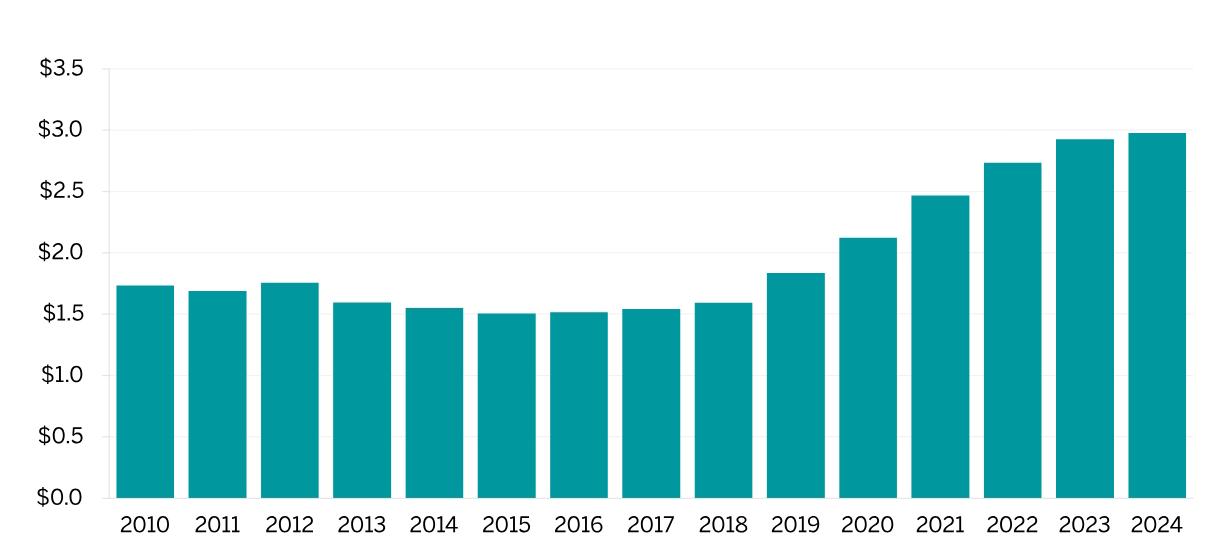 The USGA admitted market reported $3.0 billion in direct written premium in 2024 (see Figure 1). This is a 2% increase from 2023 and contributes to an 87% cumulative surge from the $1.6 billion reported by insurers in 2018. This growth period represents the largest increase in written premium for the USGA market since the era immediately following 9/11.