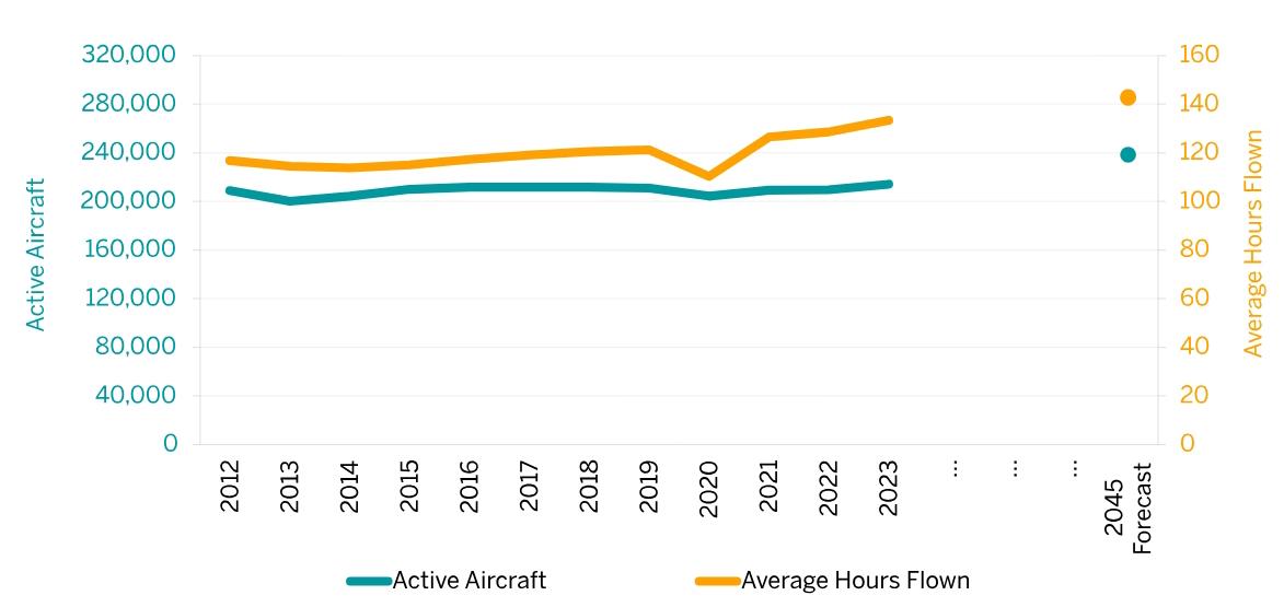 previous decade and is expected by the FAA to continue its upward trajectory through 2045 at a rate of 0.3% per annum. The FAA forecasts that fixed-wing piston average hours will decrease (due to an aging fleet), whereas turbine (including rotorcraft) and jet aircraft are the drivers behind the prospective overall increase.