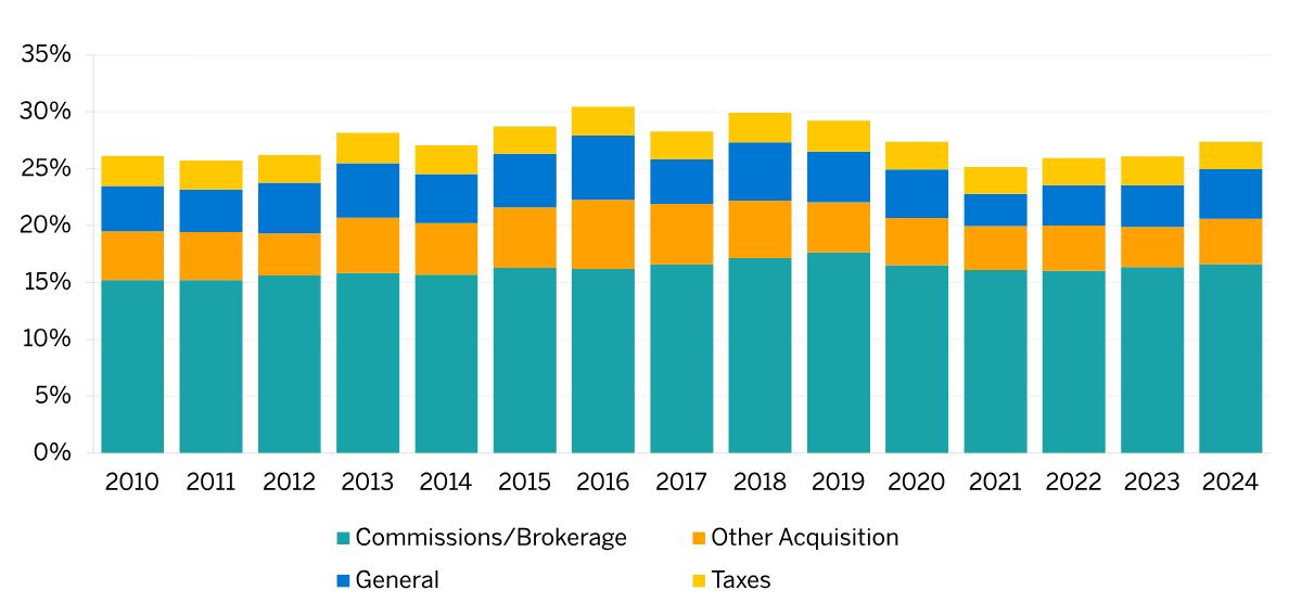Although top-line revenue was once again higher, the 2% overall market growth in 2024 is the smallest percentage-point increase since 2017. Fiftyfour percent of admitted carriers who wrote at least $10 million in 2023 reported higher written premium in 2024, whereas over the past few years, the same metric has averaged over 80% which coincided with the market’s more notable expansion.