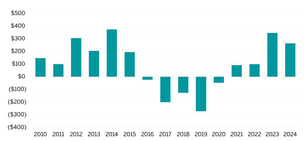 For a longerterm view, the post-9/11 rate increases led to 14 consecutive years of underwriting profitability for the market (2002 through 2015). Thus, after nearly $700 million in losses between 2016 and 2020, the underwriting profits in 2021 through 2024 have demonstrated that profitability may once again be trending in the right direction for long-term sustainability. It should be noted,