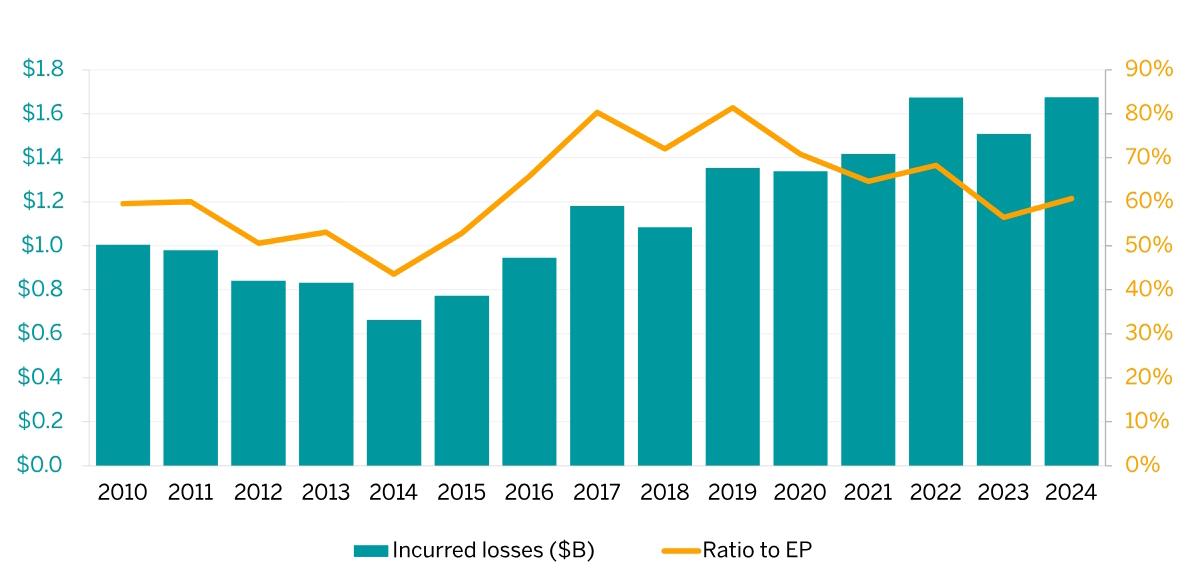 Poor underwriting results in the late 2010s were the catalyst for the USGA market’s recent firming. From 2016 through 2020, the market lost approximately $700 million on an underwriting basis (i.e., excluding investment income), as displayed in Figure 3. In 2019 alone, the market lost nearly $300 million on $1.8 billion in premium. The aforementioned rate increases toward the end of this period of unprofitability guided the USGA market to small underwriting profits each year since. The 2023 and 2024 underwriting income represents a return to the profit level experienced by the industry in the years leading up to 2016.