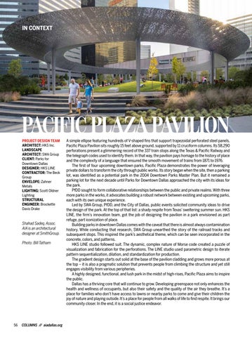 PACIFIC PLAZA PAVILION PROJECT DESIGN TEAM ARCHITECT: HKS Inc. LANDSCAPE ARCHITECT: SWA Group CLIENT: Parks for Downtown Dallas DESIGNER: HKS LINE CONTRACTOR: The Beck Group ENVELOPE: Zahner Metals LIGHTING: Scott Oldner Lighting STRUCTURAL ENGINEER: Brockette Davis Drake
