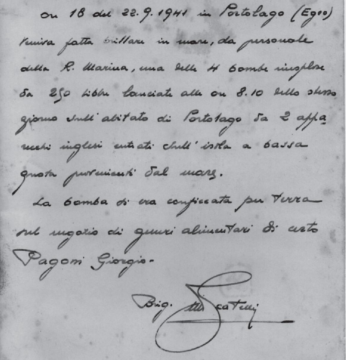 [Una bomba inesplosa dopo un bombardamento della RAF nel settembre '41 viene fatta brillare a mare a Portolago e la descrizione autografa riportata sul retro della foto]