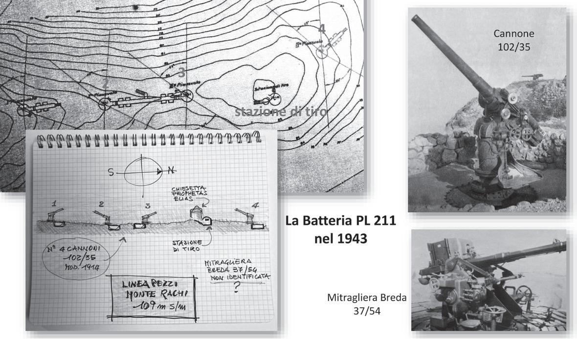 La batteria PL 211 (PL è l’acronimo di Pezzi Leggeri) poteva contare su quattro postazioni di cannoni 102/35 modello 1914 collocate in fila indiana da Nord a Sud lungo la dorsale di Monte Rachi (quota 109 m s/m), dotate ognuna di una riservetta sotterranea per le munizioni. Il 102/35 era un cannone della Ansaldo, prodotto all’epoca della Prima Guerra Mondiale. Come noto negli ambienti militari e palesatosi in combattimento, i 102 erano facili alle avarie e non atti al tiro prolungato. Già durante il primo conflitto mondiale furono sostituiti dal più prestante 102/45 modello 1917 e tra le due guerre dal 120/45. Ma a Lero nel 1943, per combattere contro i micidiali Stukas e Junkers della Luftwaffe, erano fermi al 1914 e a una tecnologia bellica ampiamente superata. Dopo le prime settimane di combattimento i molloni dei meccanismi di rinculo dei cannoni erano snervati per l’eccessivo lavoro e l’impropria necessità di sparare con un alzo elevato verso gli obiettivi provenienti dal cielo. Le canne esauste per le temperature raggiunte. I dispositivi di regolazione e puntamento usurati dall’impiego e danneggiati dalle schegge che, in assenza di efficaci protezioni, schizzavano ovunque. Alle bocche da fuoco della 211 si aggiungevano una mitragliera contraerea automatica a canne binate Breda 37/54, per impiego a corto raggio (molto efficace anche se non priva di complicazioni meccaniche), oltre a un limitato assortimento di armi leggere e bombe a mano per la difesa ravvicinata.