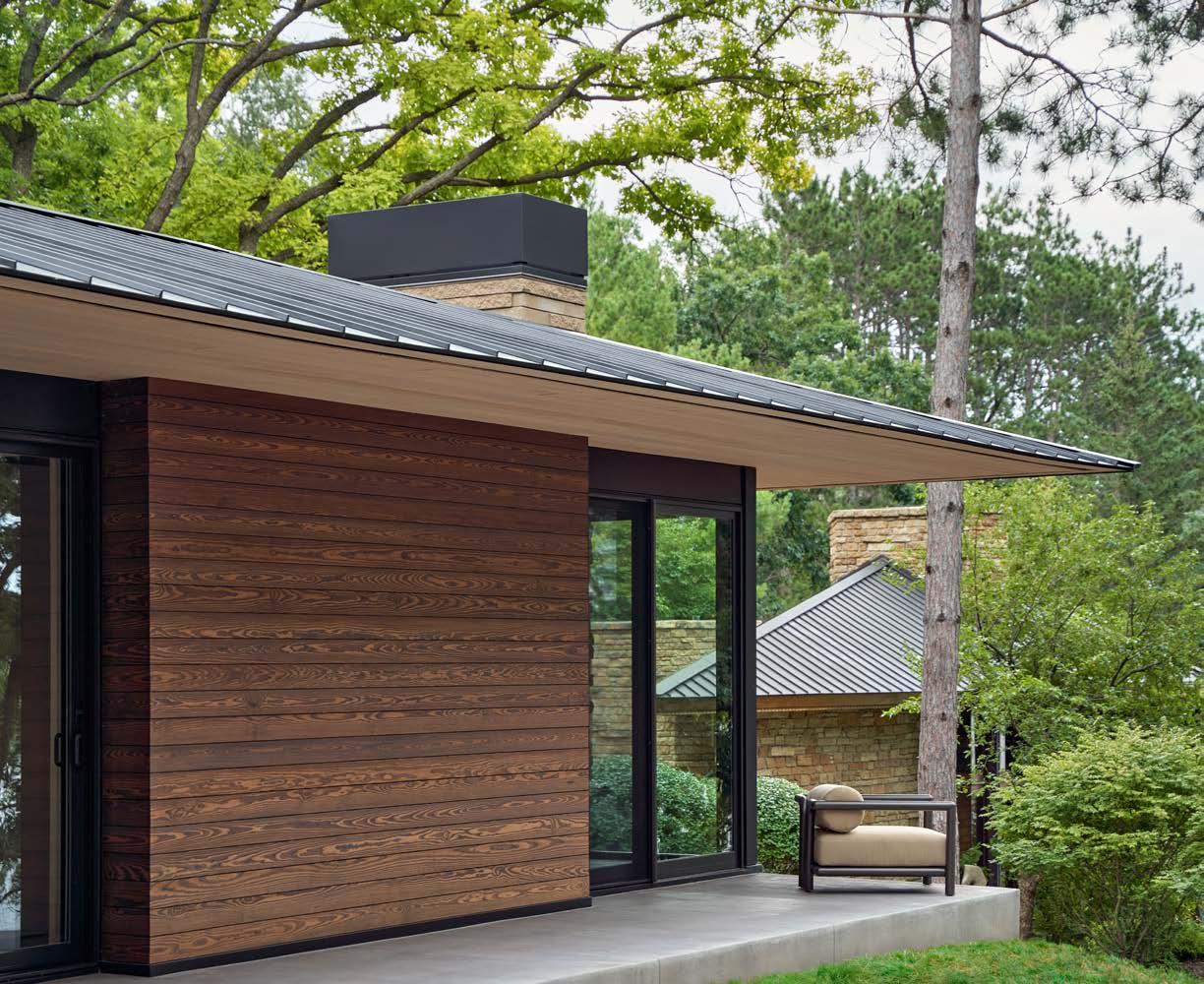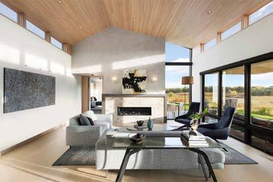 The house incorporates lake views and a neighboring connection to the Wright home into a design geared for well-being and energy efficiency. Lowmaintenance, locally sourced, thermally modified pine exteriors are joined with concrete surfaces throughout the home, sourced by a local fabricator. Fireplaces are designed to give an appearance of