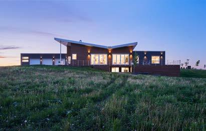 reveal glimpses of the prairie beyond. A double-height stair hall with an 18-foothigh wall of windows welcomes visitors. Once inside, a low-ceiling entry vestibule opens to a double-height living room that has a two-story wall of windows with expansive views of the prairie. A 20-footlong folding door extends the indoor living seamlessly to the outdoor prairie patio. A flat roof with a parapet conceals the home’s solar panels across the main cross gable.