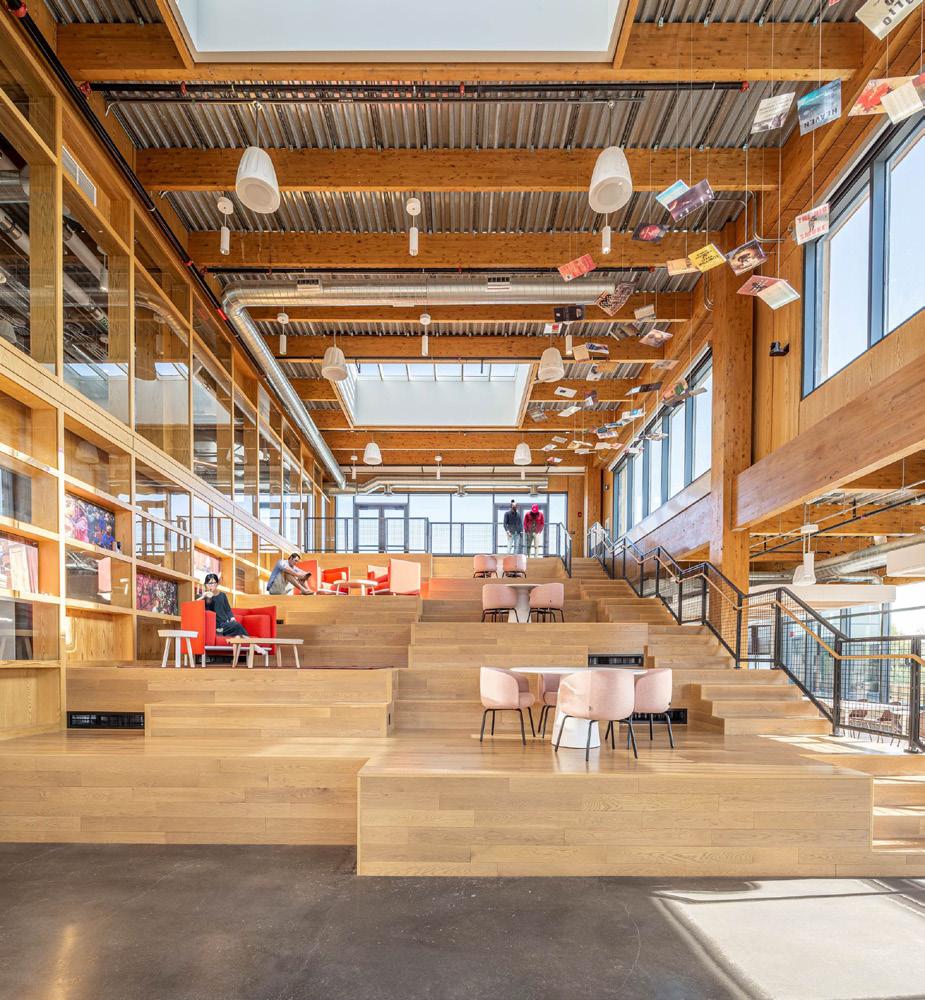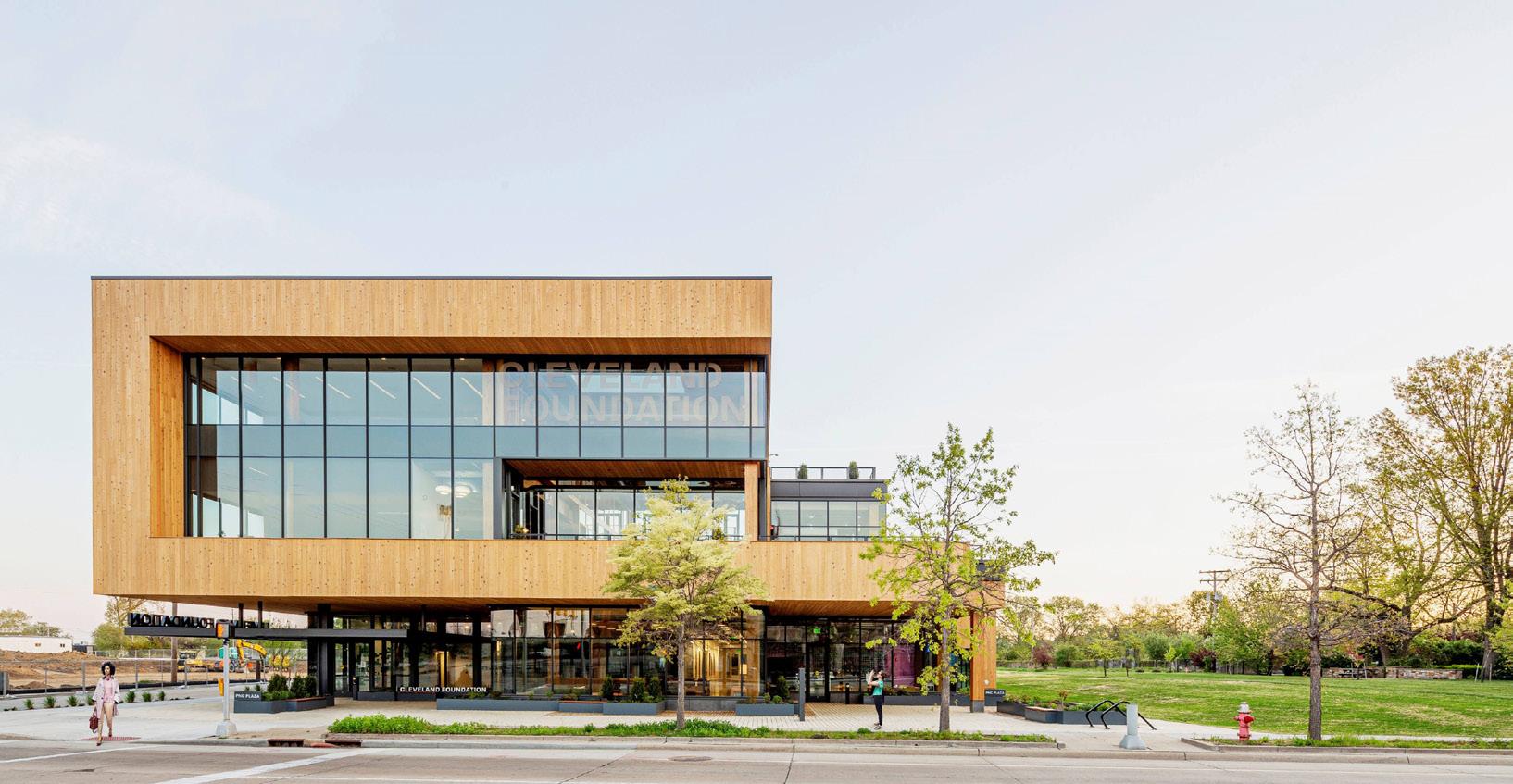 The Euclid Avenue façade is a cantilevered curtain wall symbolizing transparency and optimism. The industrial grid of the building, reflecting the surrounding neighborhood, is reinterpreted with warm wood finishes, large porous storefronts, and welcoming public entries. The design creates visual and functional connections to the park, street, and civic context, reinforcing engagement with the community.