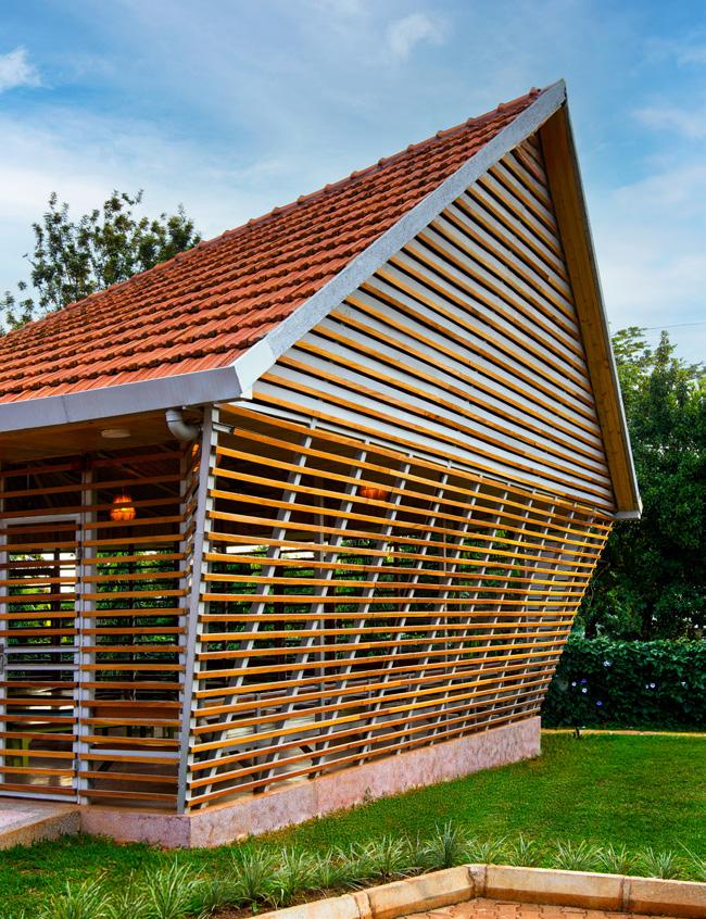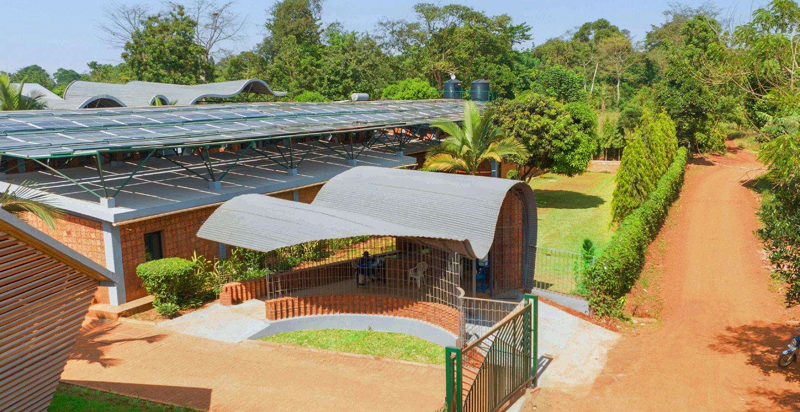 The Pavilion includes a check-in desk, cashier counter, and two triage rooms. Patients are registered and triaged here, and payments are processed if needed. The space also supports large health education gatherings and staff meetings, emphasizing its multifunctional role within the campus. Sustainable features are embedded throughout the design. Ridge vents in the roof expel hot air, while the underside is lined with locally crafted reed mats for insulation and protection. Louvers surrounding the seating area facilitate cross ventilation and provide privacy. Materials such as CMU blocks, bamboo, reeds, stock steel, and locally manufactured Mangalore tiles reflect environmentally conscious, culturally attuned design.