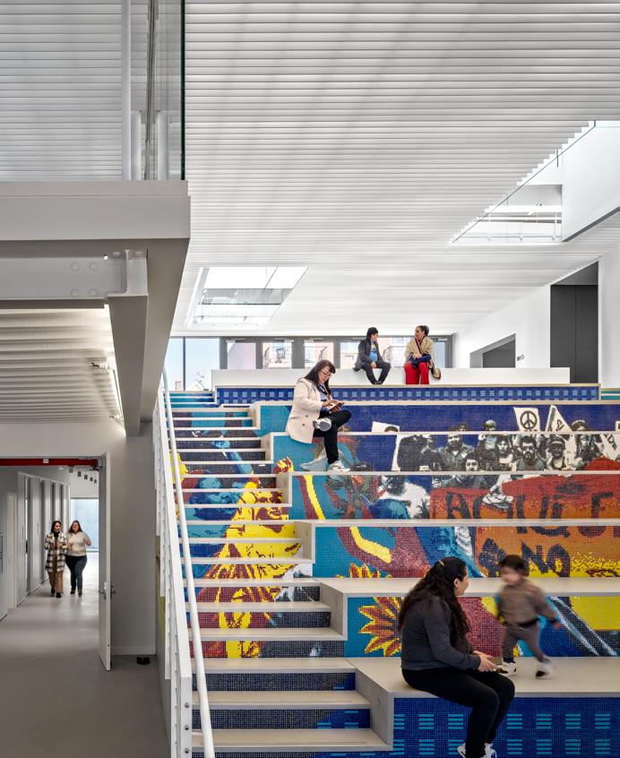 The building’s terraced main hall doubles as a town hall, hosting staff meetings, member gatherings, community dinners, and civic events. Adjacent classrooms are flexible, allowing workshops to operate simultaneously with other programs. A fully equipped basement kitchen supports communal cooking, distributing meals via elevator and dumbwaiter systems, while art and activity rooms provide space for creative programming. The upper floor integrates open workspaces and private offices, with three large light wells flooding the conference and meeting rooms with daylight, and rising above the roofline as visual beacons for the surrounding city. Materiality and circulation are carefully orchestrated to foster connection. Wide stairways, terraced seating, and integrated ramps reinforce accessibility, while the internalized landscape encourages informal gatherings and community interaction. Every space is designed to support the organization’s mission: empowering members and building capacity for positive change.