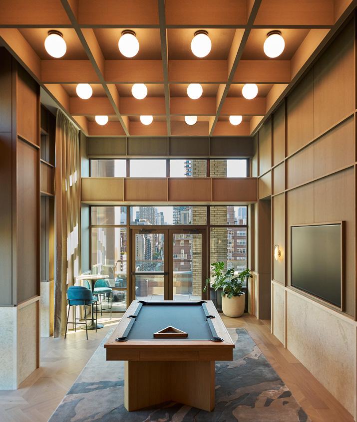 On the 16th floor, an amenity kitchen and dining room, billiards room, library, great room, and co-working lounge with private work pods and terraces offer spaces for social connection and events. Stone wainscot, oak-paneled walls, bronze finishes, and reeded glass complement 360-degree views of the city. The 34th floor hosts a small lounge, bar, and outdoor cooking terrace, ideal for sunset gatherings.