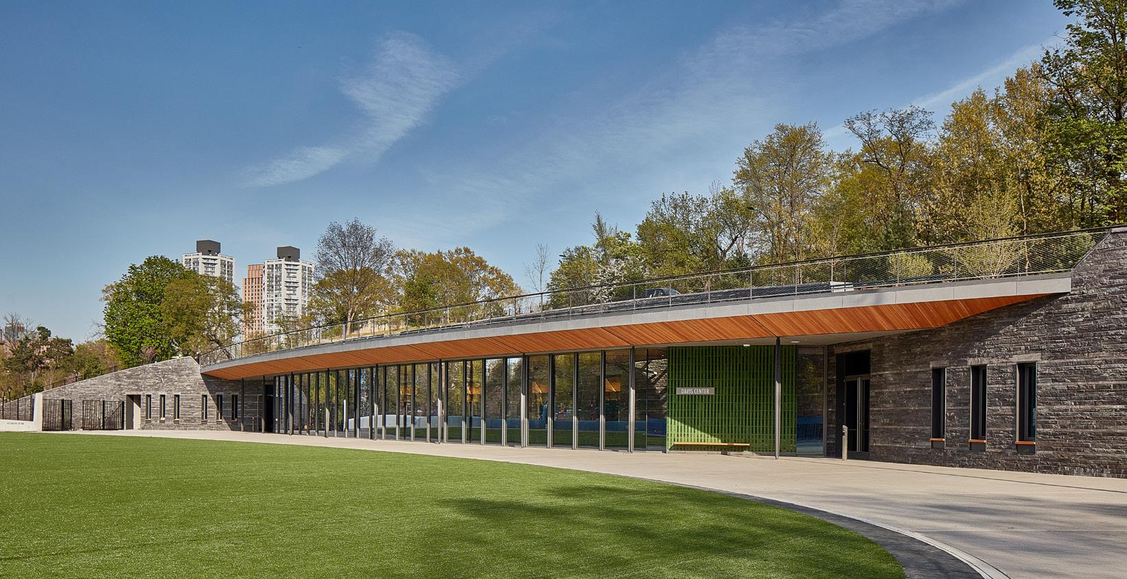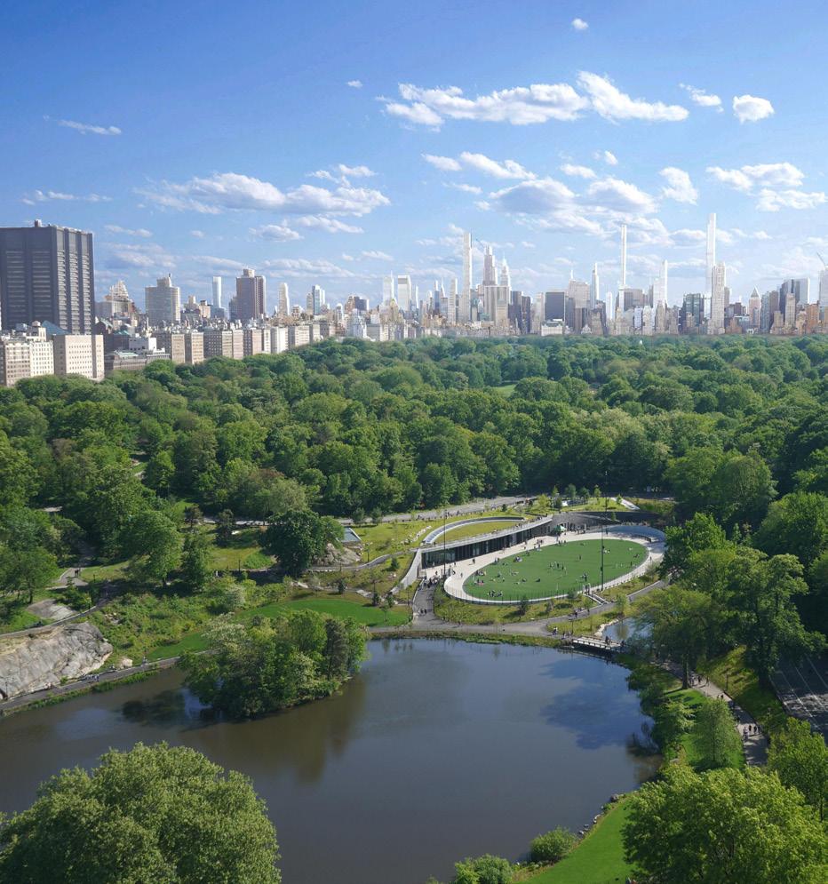 The Davis Center provides year-round recreational access within Central Park, reconnecting the community to the Park through an innovative design integrated into the natural topography. Curvilinear park paths guide the building’s placement, and a green roof blends the structure into the surrounding landscape, creating terraces, overlooks, and a monumental outdoor room that adapts seasonally from a pool to an ice rink and open lawn.