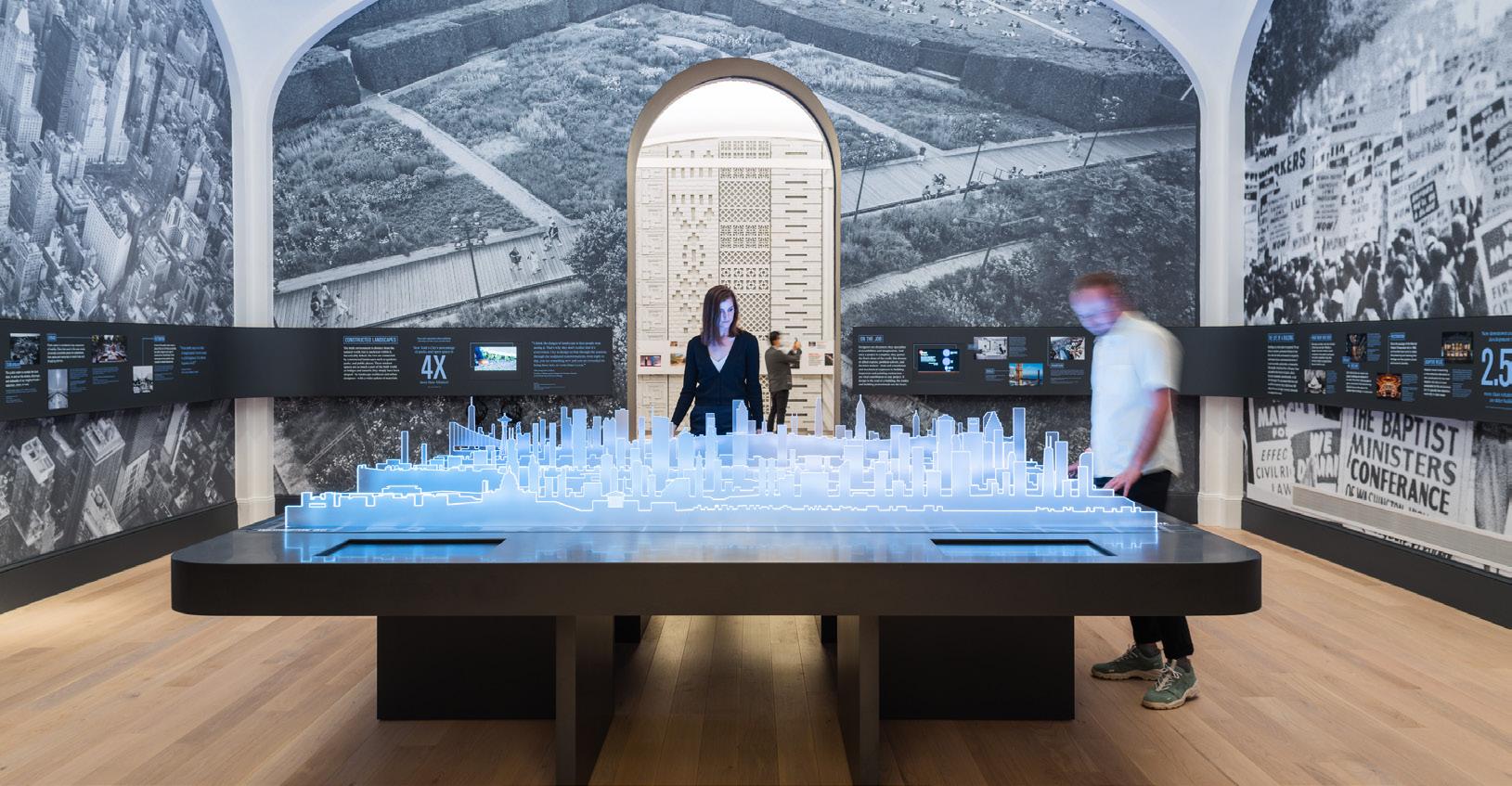 The Orientation Center and Welcome Galleries provides wayfinding orientation, ticketing, membership information, and community education, including interactive learning experiences and exhibits drawn from the Museum’s archive. More than functional, it reflects the National Building Museum’s mission to highlight the building industry’s role in the planet’s ecology and the impact of growing development. Creating this experience required a collaborative design process to translate the narrative into a bold, engaging, and inclusive physical environment. Accessibility features include neuro-sensitive considerations, audio components, and tactile elements, ensuring the space is welcoming for all visitors.