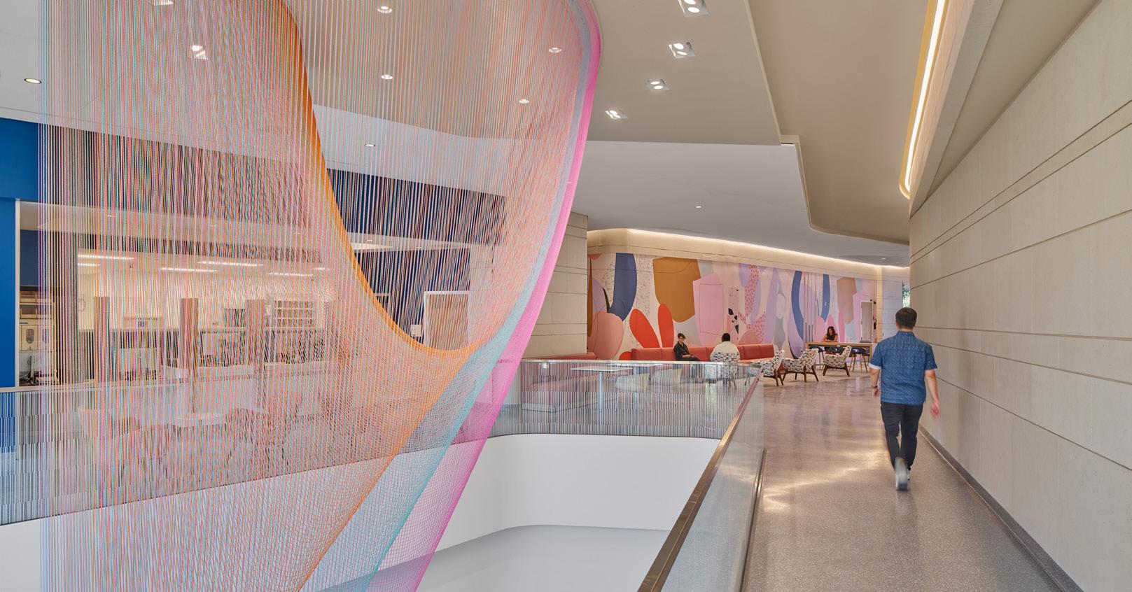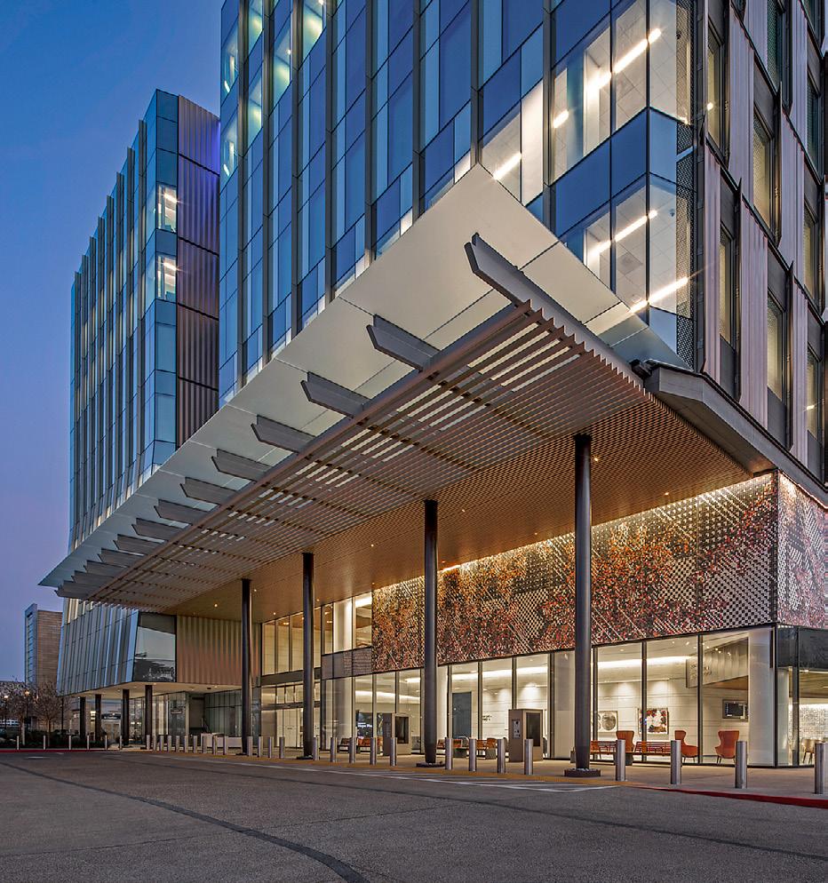 Hope Plaza is part of a larger strategy to enhance healthcare delivery through a patient-centered, healing-focused outpatient cancer facility. The eight-story, 352,000-square-foot project anchors the northeast corner of the campus, providing 110 infusion spaces, radiation oncology rooms, and research laboratories. The design draws inspiration from the surrounding natural environment, positioning the building as a sculptural “boulder” within an “urban river wash” landscape.