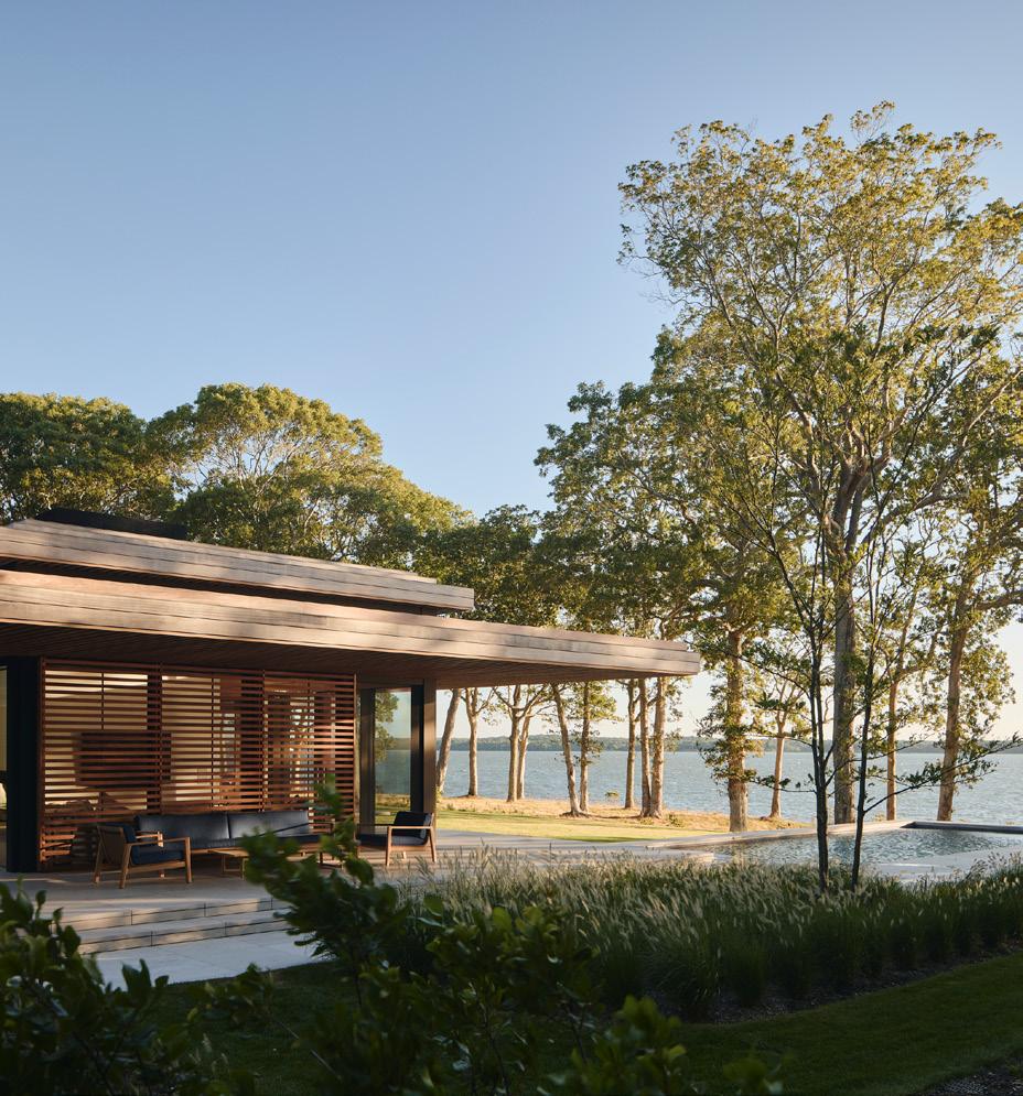 Designed for a multi-generational family, Forest Edge sits on a wooded slope overlooking an expansive bay off Long Island Sound, with views of a protected shoreline. The design emphasizes both enduring structure and intimate family connection. Composed with calm rationality, the geometry steps down in height toward the water, creating a form that lightens gradually. Living spaces open to embrace the view and daylight, while private bedrooms and wings form a sheltered arrival court.