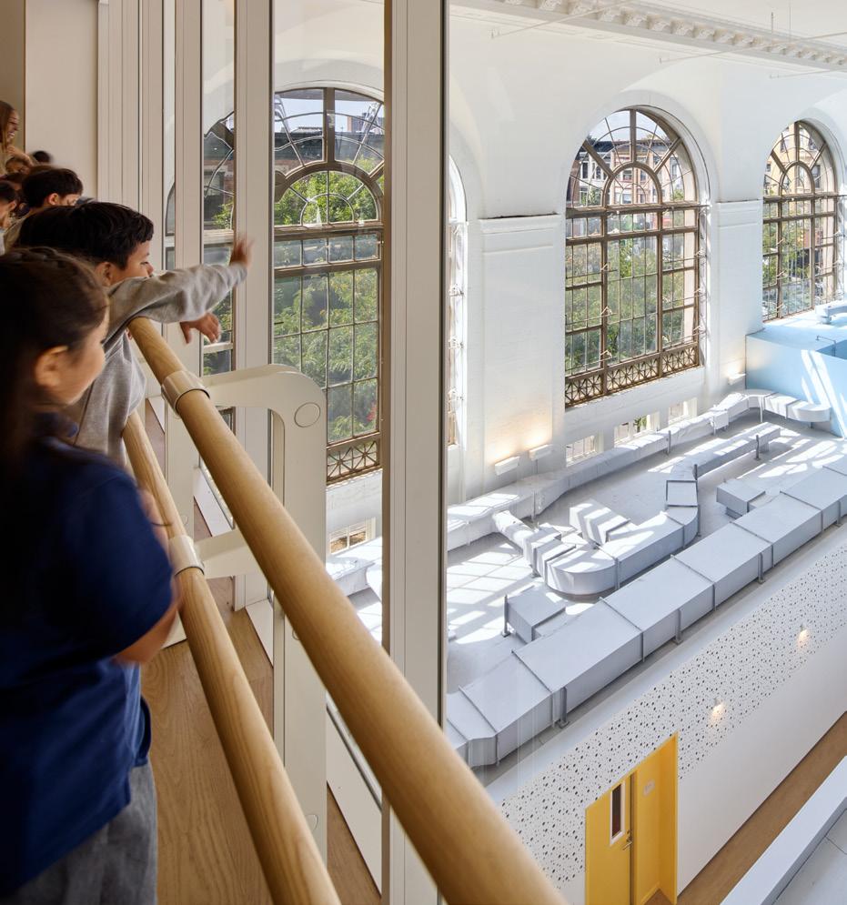 The design inserts a series of modern structures within the historic bank hall, creating a cityscape that extends the neighborhood fabric into the interior. These program volumes gradually step down the monumental scale to spaces suitable for young children. Upon entering the main hall, the triple-height space is flanked on either side by one-story classrooms, while the grand ceiling remains open and daylit through the building’s bay windows. At the far end, a two-story volume, suspended and accessed from the upper levels, houses an additional classroom, conference space, and a new dance studio. This floating program is expressed back to visitors below as a modern interpretation of the Classical Revival details found along Fifth Avenue.