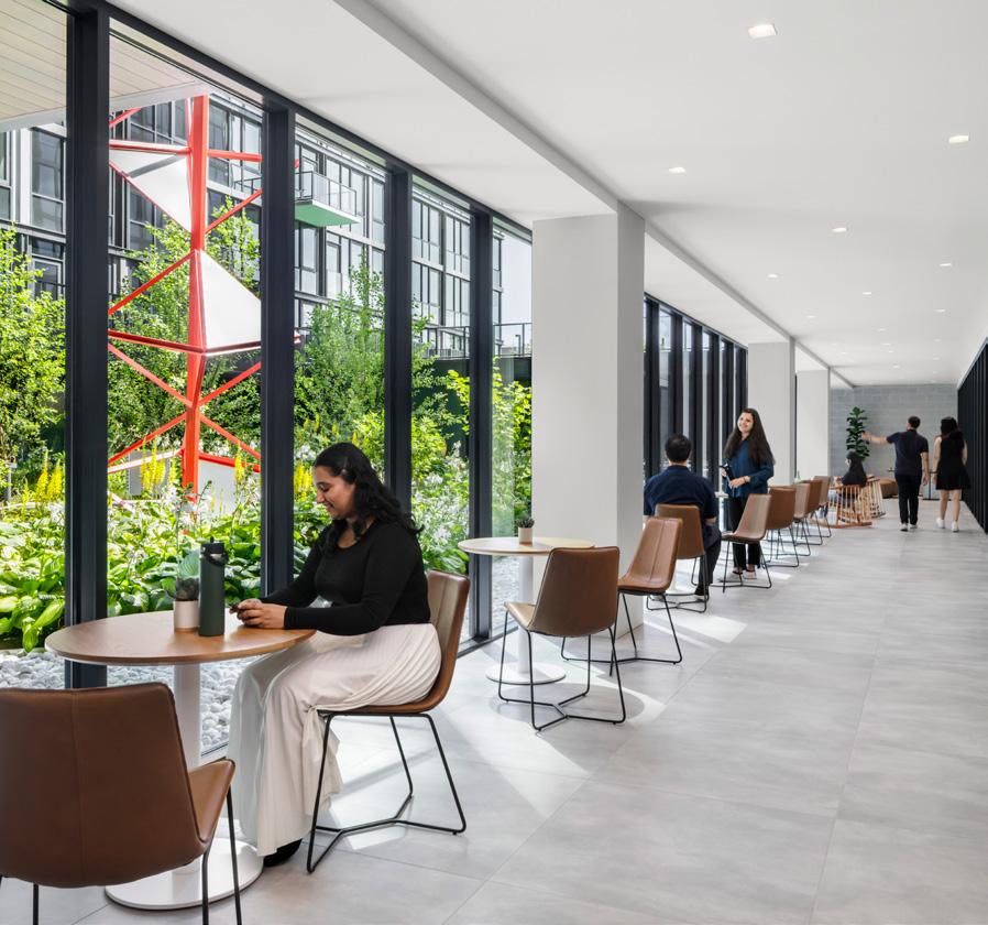 The building’s dynamic composition responds to the busy context, with robust amenities, retail, and open spaces that activate the street and surrounding plaza. Material selection emphasizes durability, sustainability, and visual interest. Large, connected atriums and high-performance glazing bring natural light deep into the building, while a variety of collaborative and quiet workspaces support the evolving needs of tenants. Exterior terraces and rooftop spaces extend the office experience outdoors.
