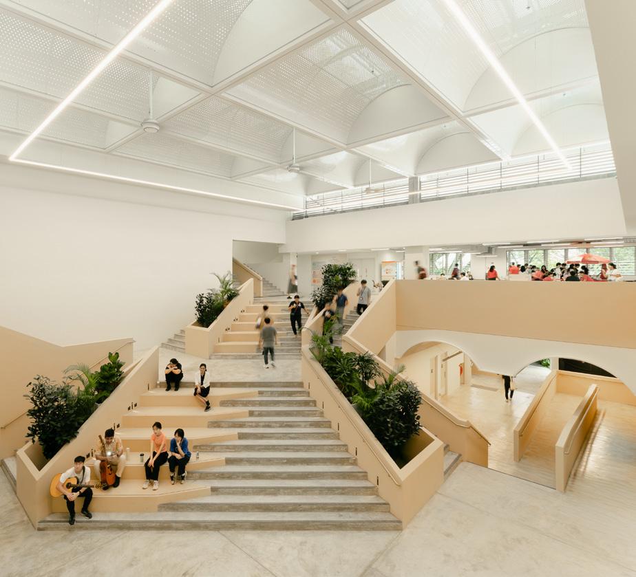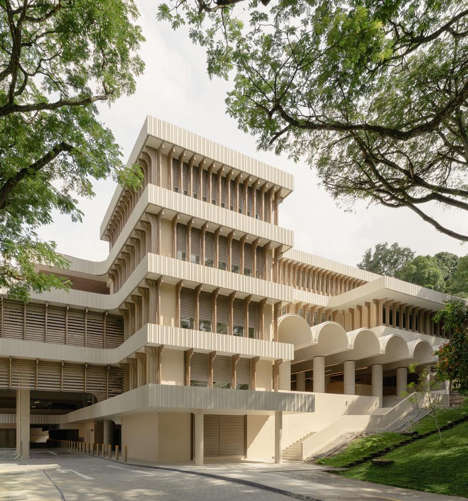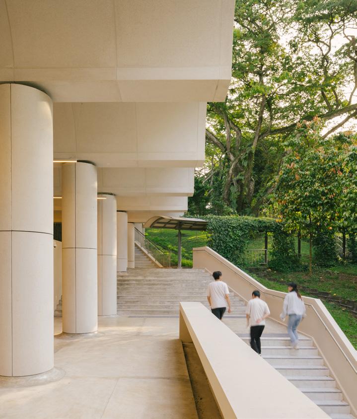 Outside, precast fluted panels and perforated vertical fins unify the façade, enhancing shade, privacy, and visual continuity with Kent Ridge topography. The Equatorial Student Commons redefines adaptive reuse, providing a resilient civic interior, net-zero energy performance, and immersive experiences, offering students a socially, environmentally, and climatically responsive heart for the campus.