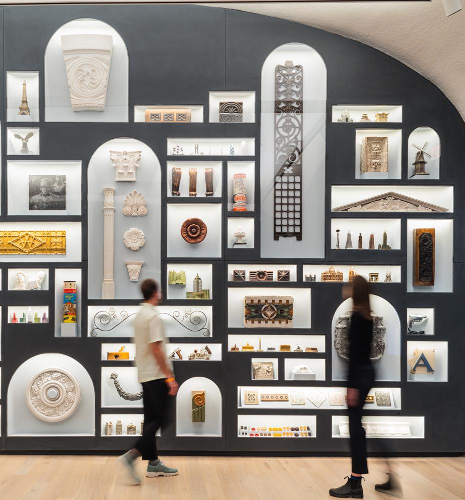 As the first point of engagement for visitors entering the National Building Museum’s vast building, the galleries serve as touchpoints for community interaction. Gallery 1 displays a monumental collection of toys, scale models, architectural drawings, and fragments of façades. The casework, inspired by the Museum’s façade fenestration, incorporates “shadow boxes” with lighting and flush enclosures. Gallery 2 focuses on urban issues, resiliency, and housing, using bold murals and media-driven displays to illustrate the construction industry’s impact on global health. Gallery 3 features full-size building façades in a textured, visceral context, using Zolotone finishes to highlight scale and pattern.