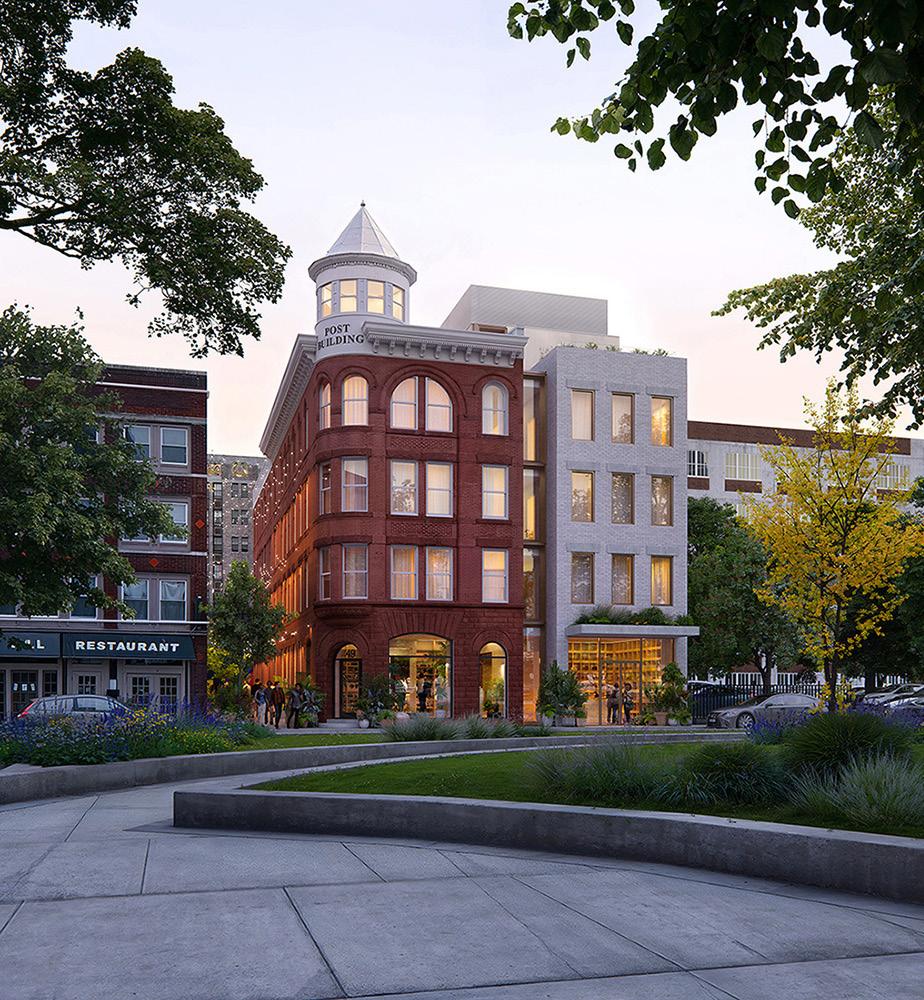 The Post Hotel transforms a historic late-19th-century red brick building through adaptive reuse and a modern addition, creating a 36-room boutique hotel that blends heritage and contemporary design. The project contrasts the ornate classical details of the 1892 structure with the minimalist light-brick façade of the new tower, maintaining the identity of both while visually uniting them with a transparent glass link. This central connector becomes the hotel’s primary circulation route, guiding guests seamlessly between old and new. Public spaces activate the street: ground-floor retail, dining, a lower-level speakeasy, and a rooftop terrace engage both hotel guests and the surrounding neighborhood. The addition extends to a rear plaza, offering outdoor dining and gathering spaces. Large plate-glass windows echo the scale of the historic arched openings, while a landscaped canopy reinforces continuity between the old and new structures.