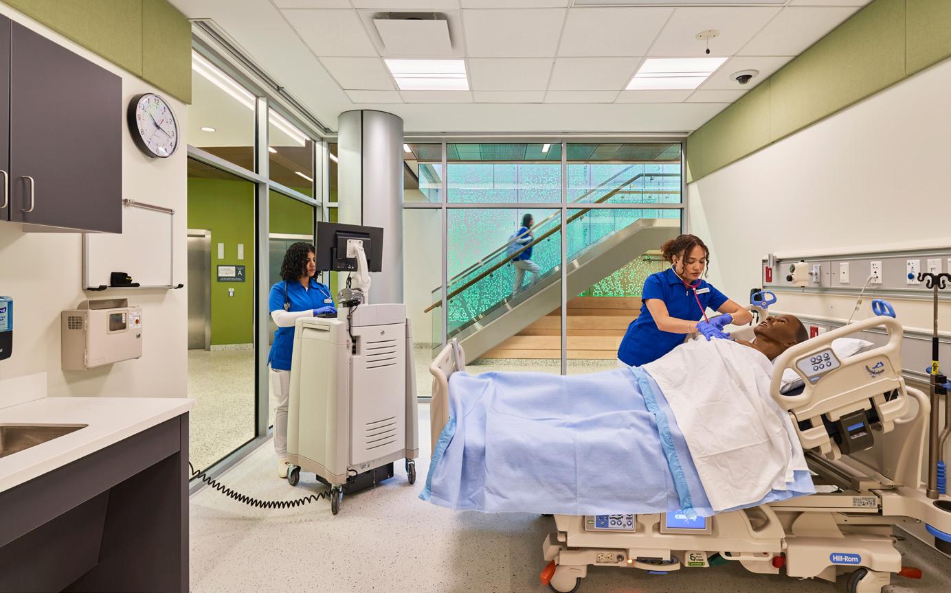 At the core of the nursing program is a nursing simulation lab with 22 programmable, computerized patient simulators to recreate a full-size replica of a clinical environment in which students are exposed to real-world procedures. There is also a 20-bed nursing skills and physical assessment lab, with debriefing rooms so students and faculty can assess their training in real-time. The intent is to offer a fully immersive training experience in a realistic, busy, hospital setting so that students may respond in-kind to a variety of incidents.