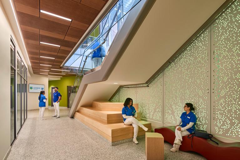 The nursing center is located at 2800 Goulden Avenue in the Kingsbridge Heights section of the Bronx, sitting cozily along the Jerome Park Reservoir between two large buildings of the Lehman College campus. The state-ofthe-art facility is situated in a new 5-story building, housing a series of classrooms, simulation labs, student lounges, faculty offices, etc. and a cellar holding the bulk of the building’s many services. Biophilic design principles were used throughout to develop a sense of connectivity to daylight and the natural environment, offering students ample places to take a break, recharge and restore themselves.
