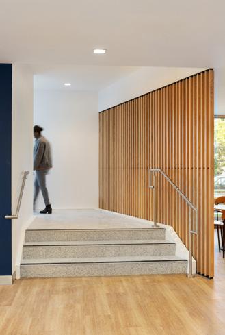 Accessibility is enhanced with a new elevator, ramp, and motorized entry doors, and the goal of environmental justice is reflected in the use of nontoxic, Red List Free finishes throughout. The redesign also promotes health and wellness: staircases are highlighted to encourage daily movement, adaptable workstations support future growth, and biophilic elements — including visual connections to nature, areas for retreat, and uplifting furnishings — foster calm, reduce stress, and create a sense of welcome.