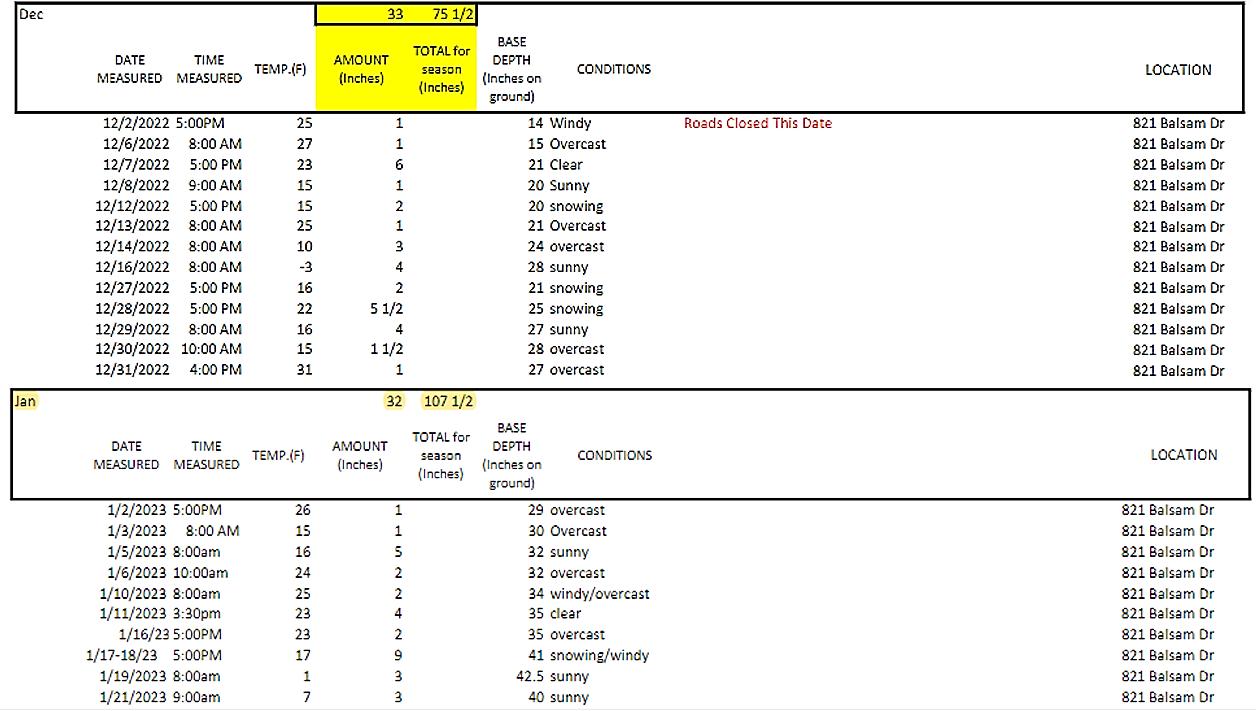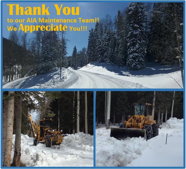 We are almost through the first month of the year and soon to be in February. We have received a lot of needed snow and our maintenance crew is doing a GREAT JOB on clearing and maintaining the Alpine Rd. As everyone knows, we have been without a grader for the last month and a half, but Will and Denny are getting by with the loaders. The grader is expected back within the next couple of weeks.